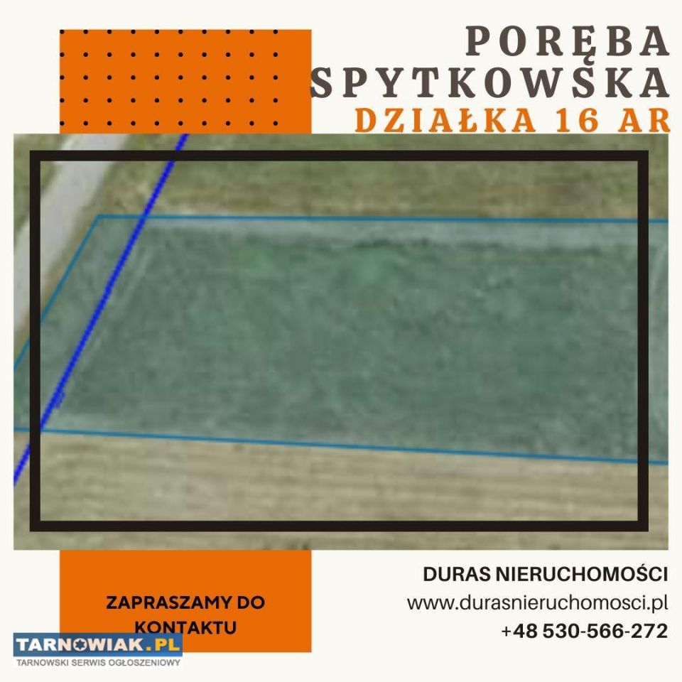Przedmiotem sprzedaży jest działka budowlana usytuowana na terenie gminy Brzesko- Poręba Spytkowska. Parcela o powierzchni 16,15 ar , nachylona w kierunku południowym, w kształcie prostokąta o przybliżonych wymiaracha 23x71, dojazd drogą gminną, asfaltową. Media: na działce wodociąg, prąd po przeciwnej stronie drogi, gaz w zasięgu 50m.
