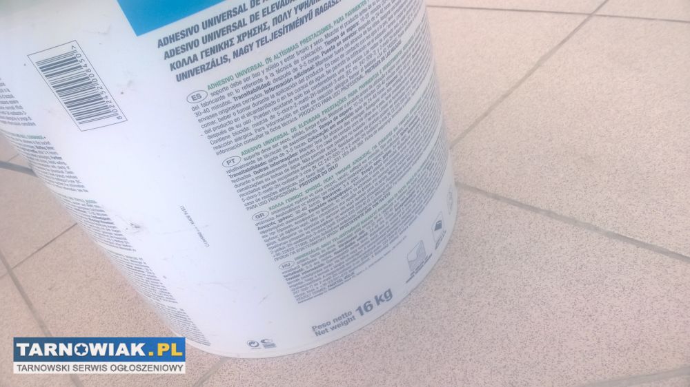 Okazja za mniej niż połowę ceny, klej do wykładzin podłogowych i ściennych o bardzo szerokim zastosowaniu. Specyfikację można znaleźć w internecie. Jest to opakowanie 16 kg. (w większości sprzedawane jest po 14 kg.)