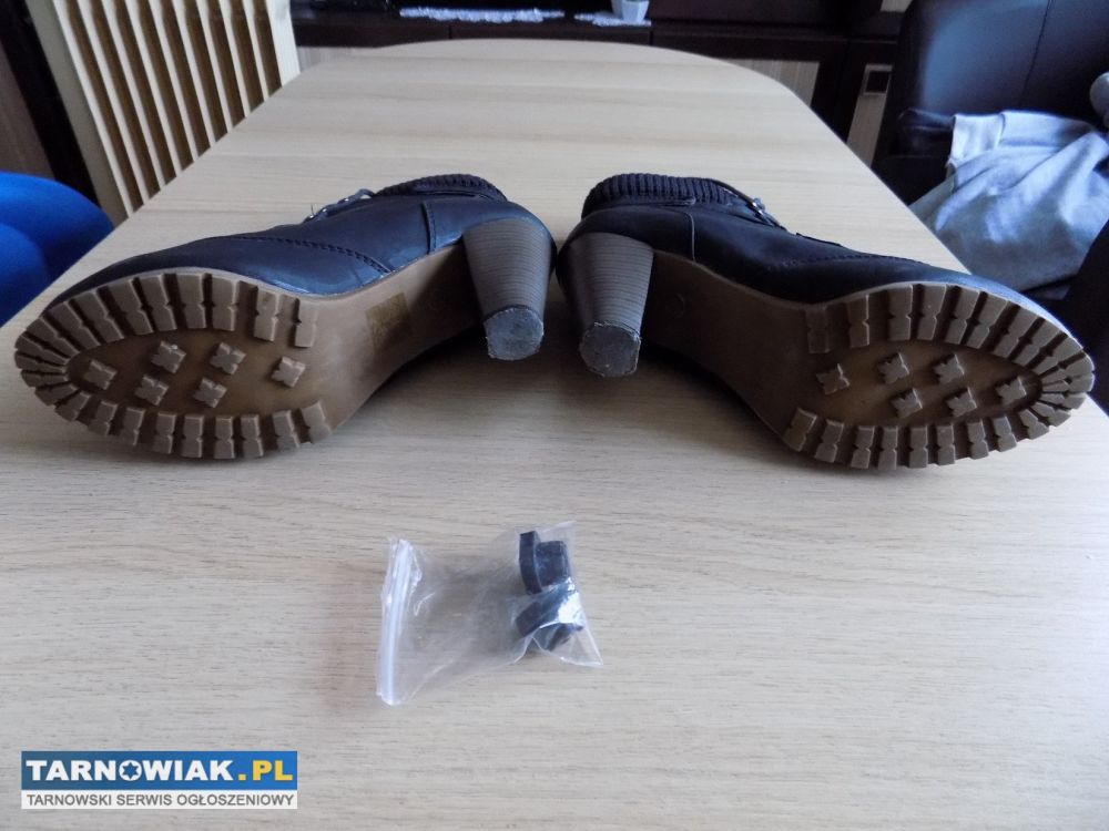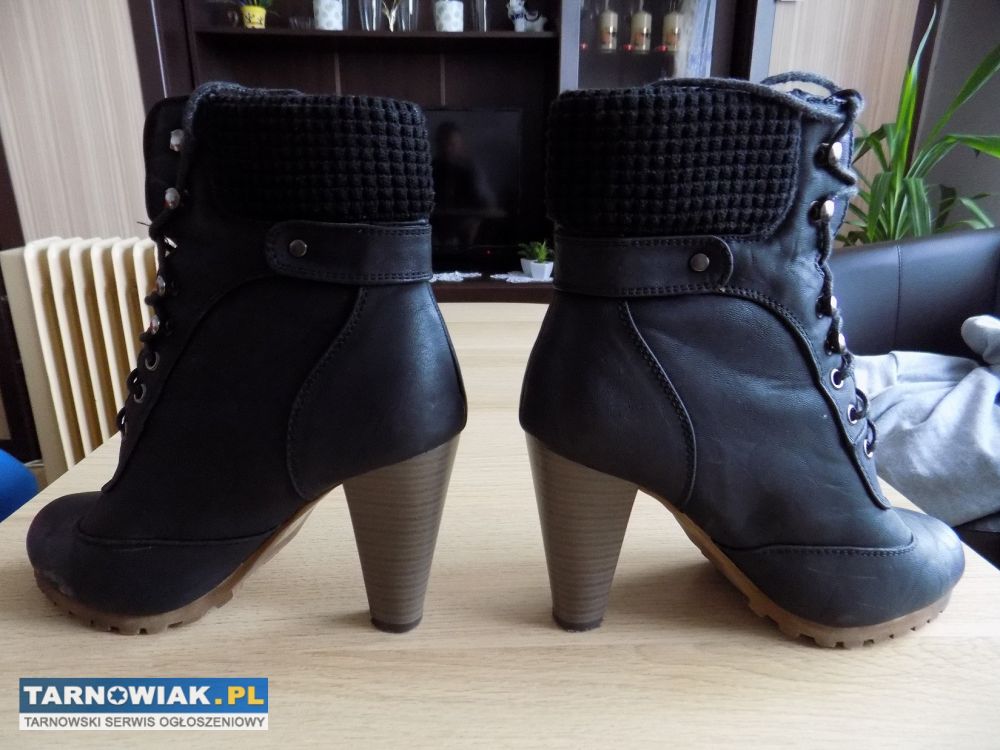 Kozaki w rozmiarze 36, sznurowane z zapasowymi flekami, ocieplane z kożuszkiem, na wysokim obcasie.