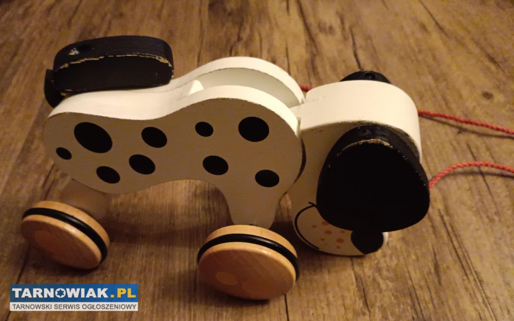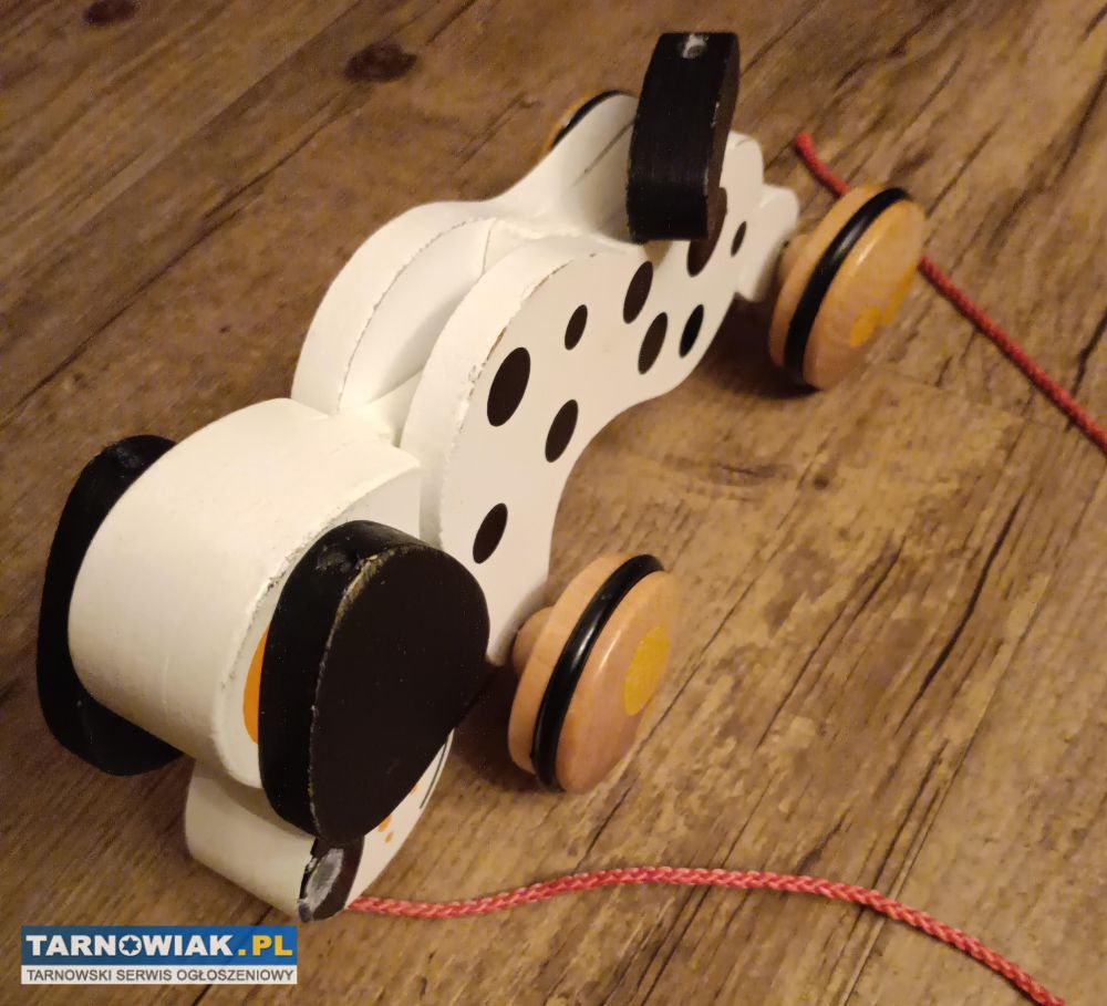 Drewniany piesek na kołach na sznurku do ciągnięcia
