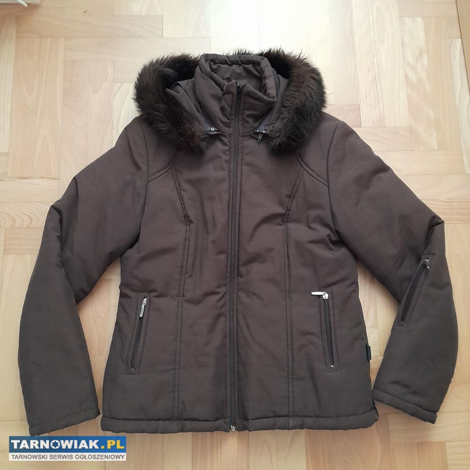 Sprzedam kurtkę zimową w rozmiarze L. Kurtka jest w kolorze ciemnej czekolady z odpinanym kapturem wykończonym brązowym futerkiem. W środku ocieplana jest polarem.