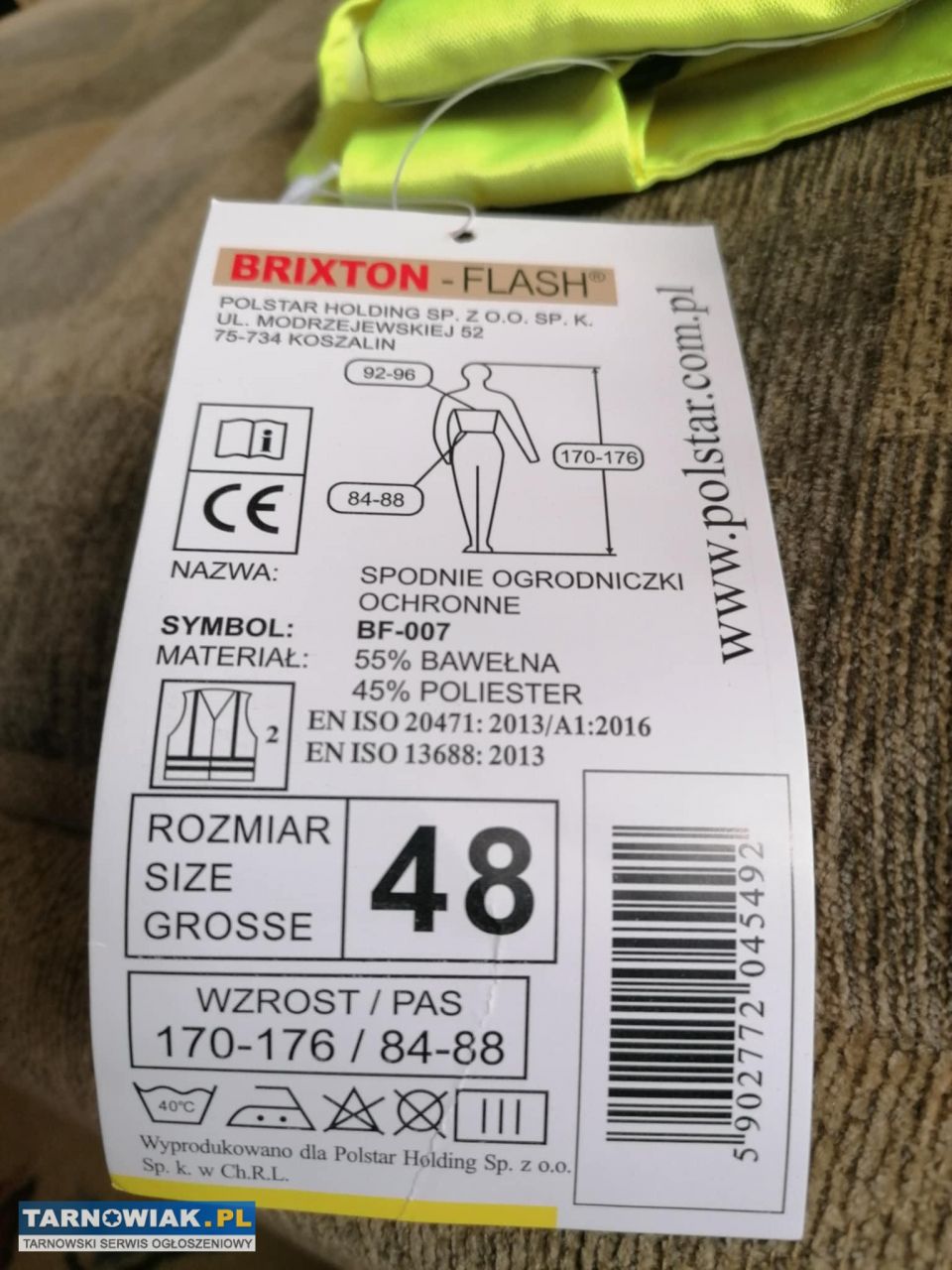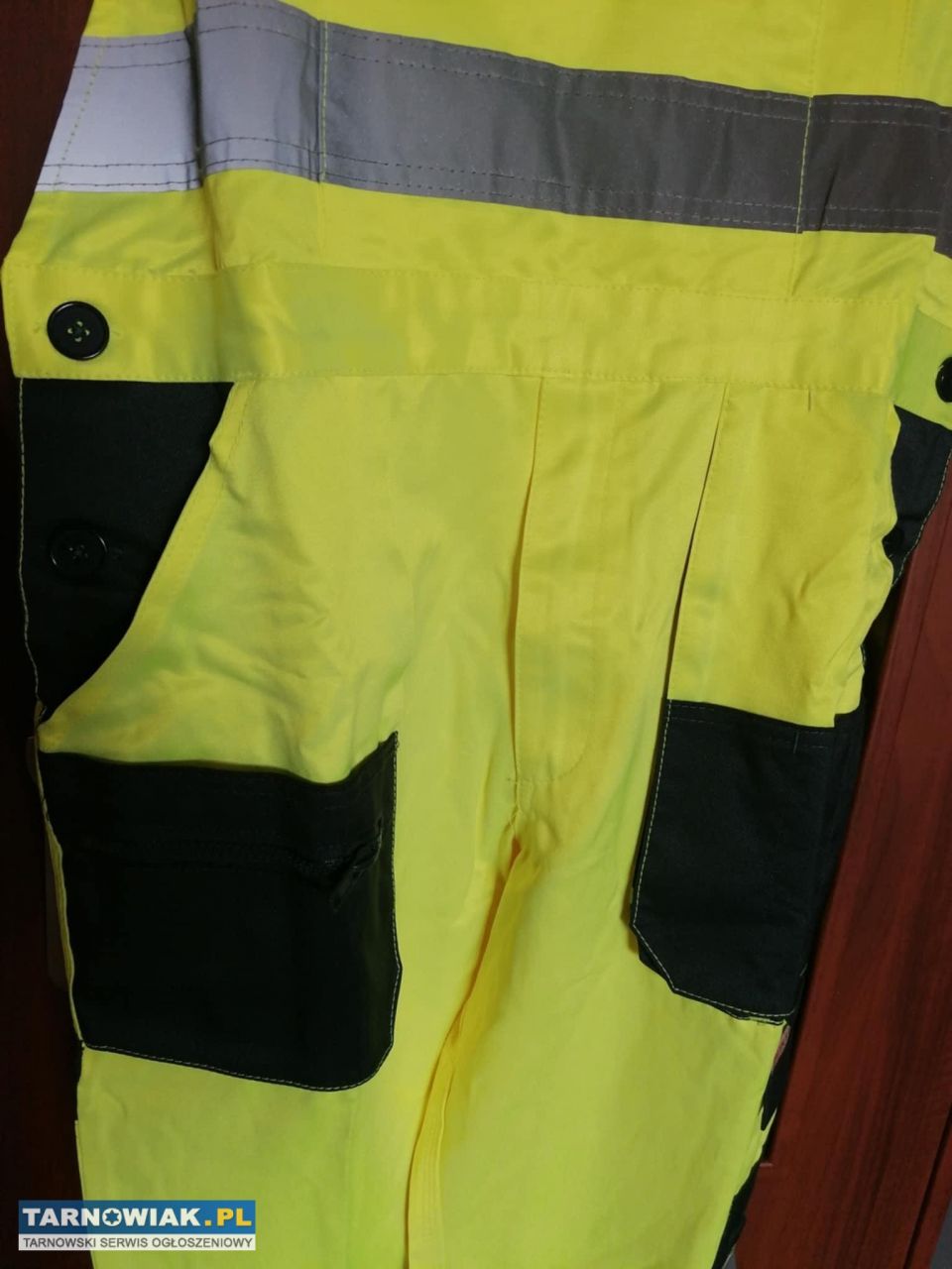 Witam — mam na sprzedaż męskie robocze ogrodniczki w rozmiarze 48. Spodnie są w kolorze jasno-żółtym z wyraźnymi srebrnymi pasami odblaskowymi i czarnymi wstawkami. Posiadają regulowane szelki, kieszenie użytkowe (kieszeń piersiowa zapinana na zamek, boczne kieszenie, kieszenie dolne), a także wzmocnienia w miejscach narażonych na przetarcia. Idealne do pracy na budowie, przy drogach, w magazynie lub ogrodzie — wszędzie tam, gdzie liczy się widoczność i bezpieczeństwo. Stan: nowy. Możliwość wysyłki in post .