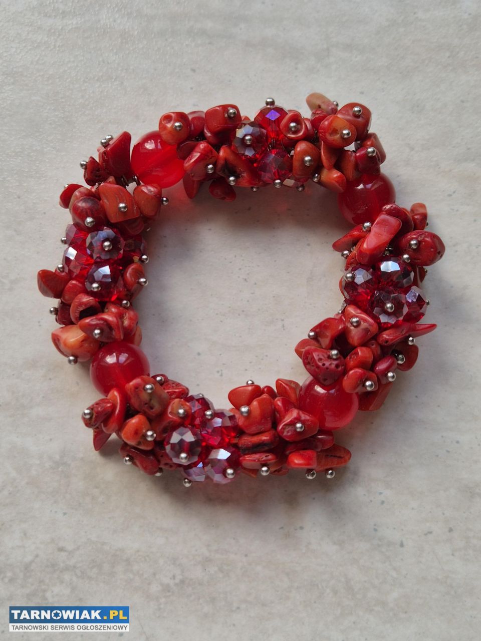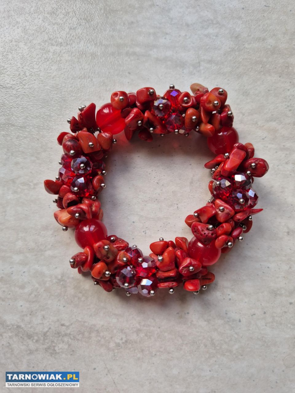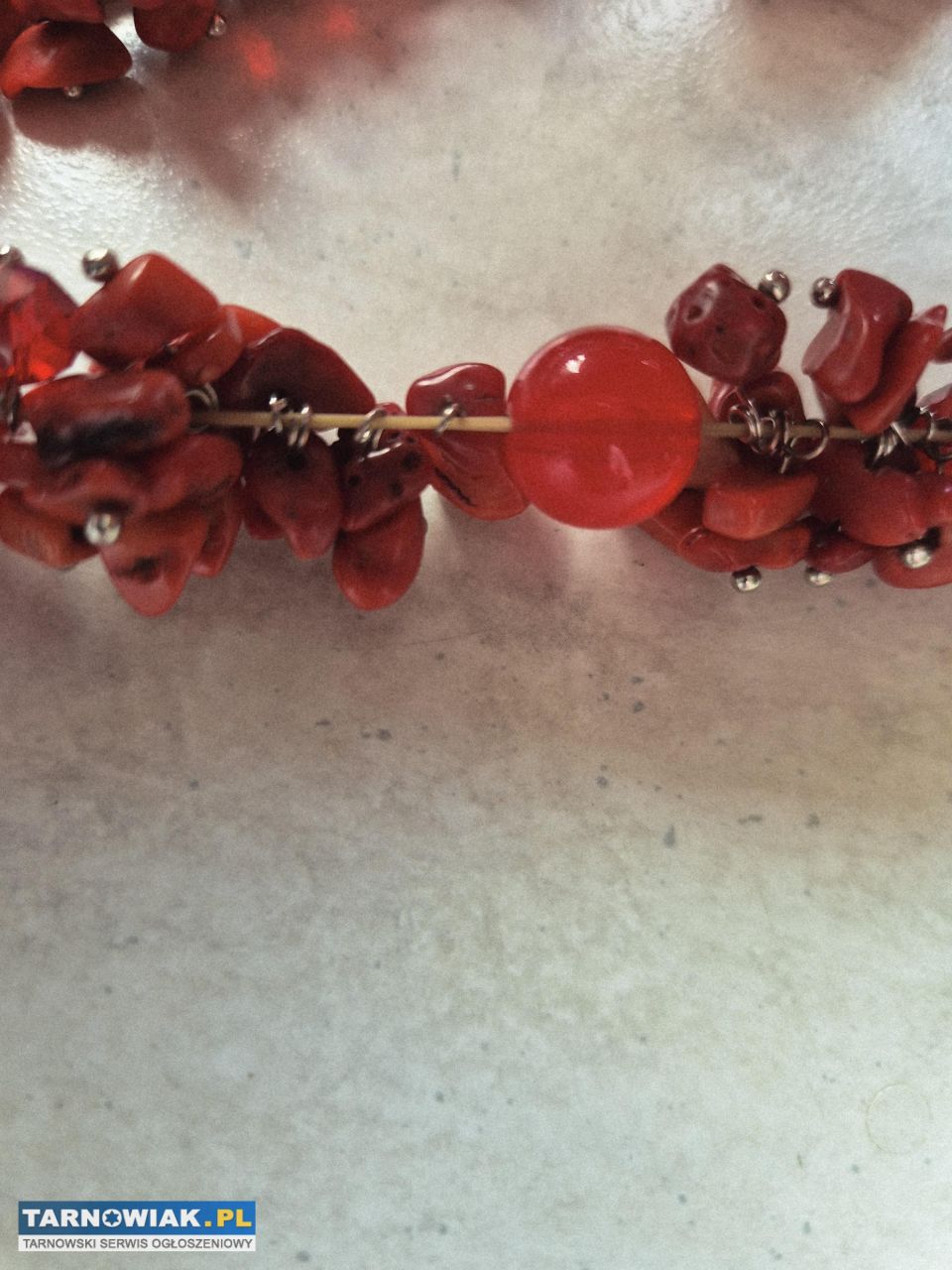 Bransoletka zrobiona z czerwonych kamyków, koralików