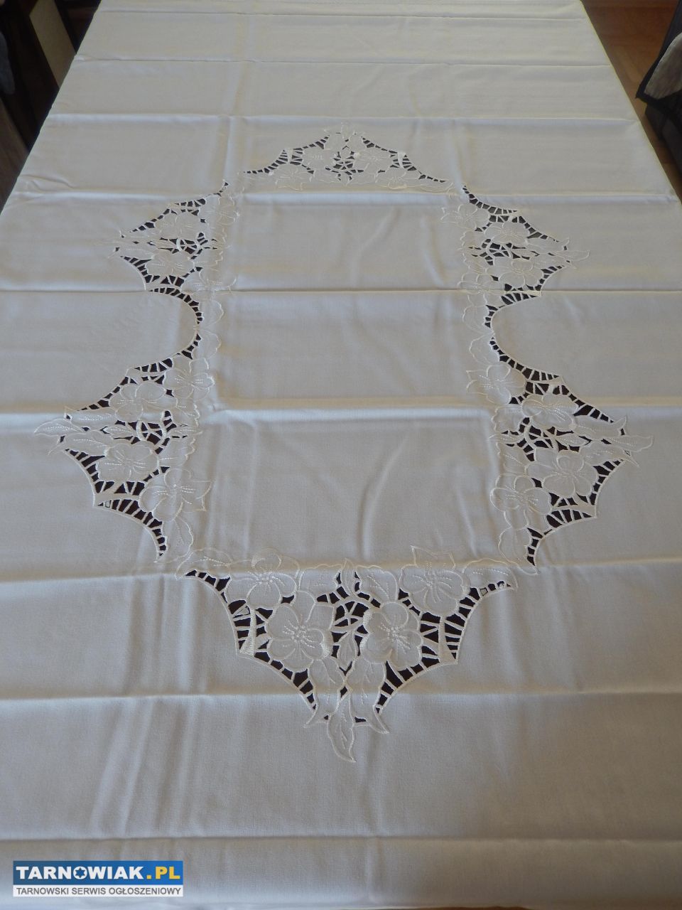 Sprzedam nowy biały obrus firmy Irys w rozmiarze 140x180. Obrus z grubszej tkaniny poliestrowej bez połysku przypominającej tkaninę bawełnianą. Na środku obrusu wyhaftowano kwiaty z elementami wycinanymi. Haft wykonano atłasową nitką z połyskiem. Brzegi obrusu zakończone kroszetką czyli przeszyciem w kształcie zygzaka.