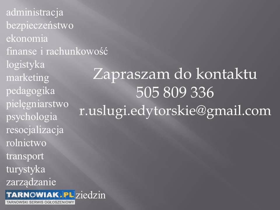 Oferuję kompleksową pomoc w zakresie pisania prac licencjackich, magisterskich, zaliczeniowych. Obejmuje ona wparcie od wyboru tematu, stworzenia planu, aż po oddanie gotowego opracowania. Jeżeli masz problem na jakimkolwiek etapie napisz lub zadzwoń. Z pewnością pomogę.