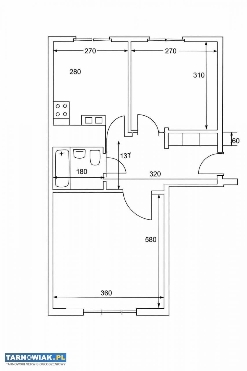 Mieszkanie składa się z : dwóch niezależnych pokoi, osobnej kuchni, łazienki oraz przedpokoju, jest ccw.