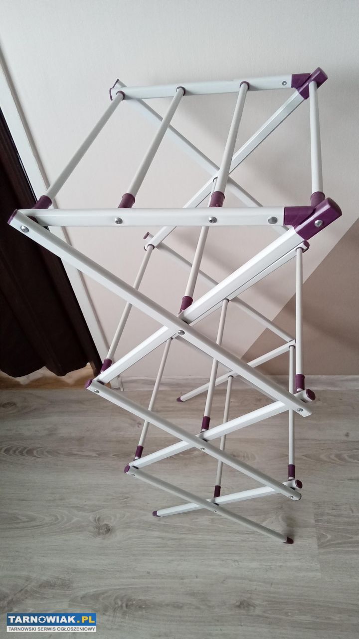 Jak nowa składana i rozsuwana suszarka na ubrania rozmiar złożony to 44/52cm ,rozłożona to szerokość 44cm głębokość 38cm,wysokość 100cm,po rozsunięciu szerokość 72cm,pod spodem brak jednej zaślepki pokazane na zdjęciu co nie przeszkadza w używalności i stabilności za 35zl