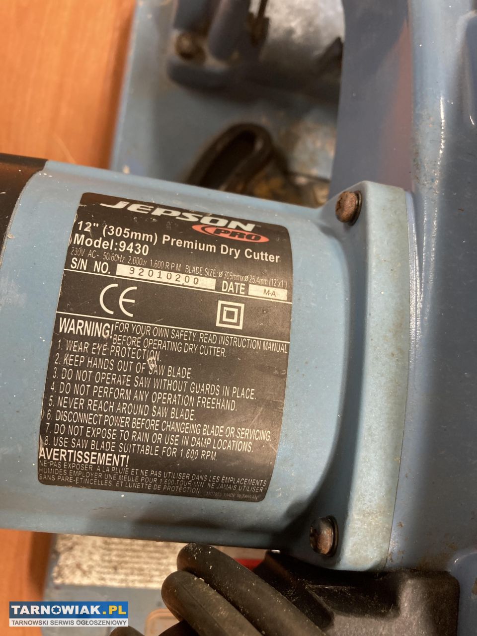 Sprzedam piłę do cięcia metalu JEPSON 9430 , moc 2000 W , tarcza 305 mm. Pojemnik na opiłki. Piła sprawna , stan techniczny bdb, a wizualny jak na zdjęciach,bardzo mało używana. Cena nowej zaczyna się od 3700 zł.W razie pytań proszę dzwonić.