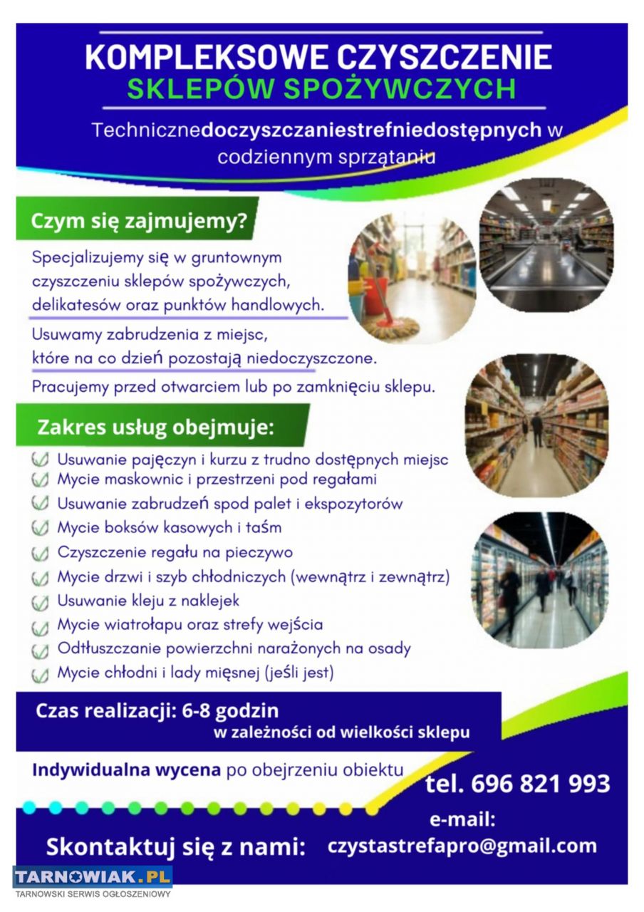 Witam oferuję państwu gruntowne sprzątanie przygotowanie pod sanepid i nie tylko sprzątanie obejmuje zakres wymieniony na zdjęciu i więcej w każdej kwestii jest możliwość uzgodnienia wszystkiego sprzątanie obejmuje sklepy Spożywcze markety i nie tylko więcej informacji udzielę telefonicznie lub mailowo