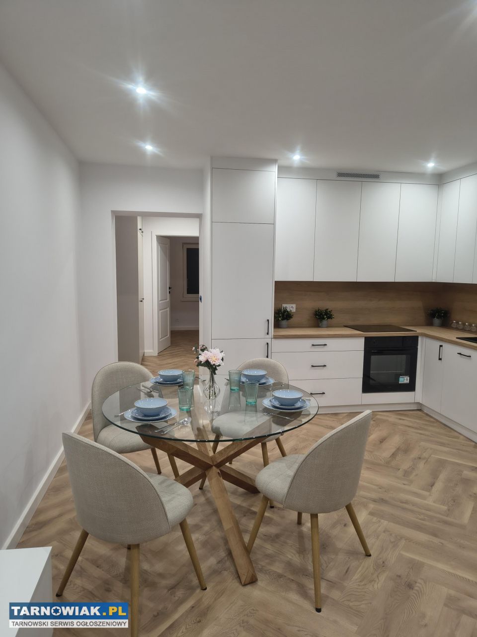 Kuchnia jest w pełni wyposażona w sprzęt AGD (m.in. lodówka, płyta grzewcza, piekarnik), co pozwala na komfortowe użytkowanie od pierwszego dnia.