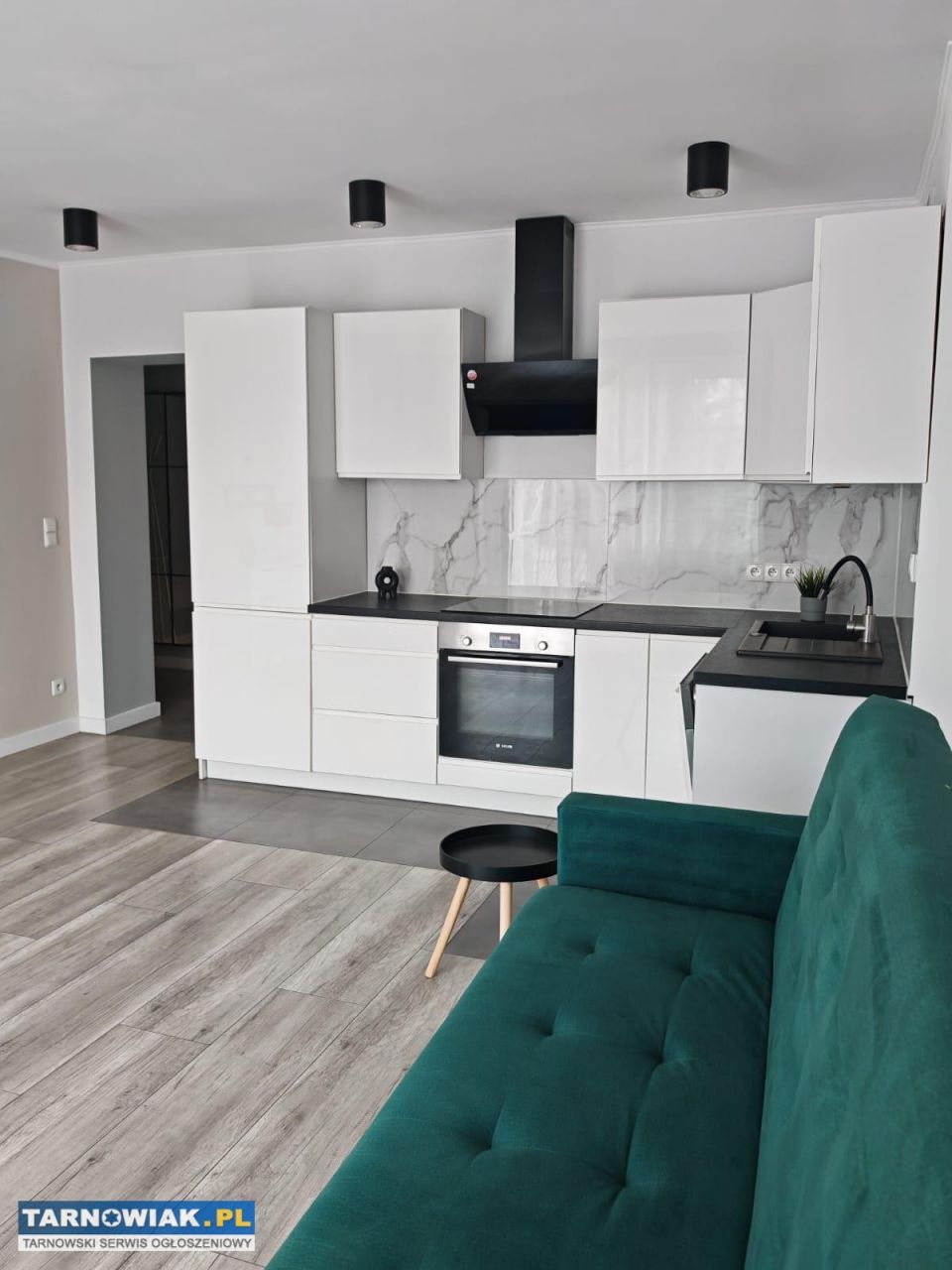 Połączony z jasną, w pełni umeblowaną kuchnią. Na wyposażeniu: lodówka, piekarnik elektryczny, płyta elektryczna, pochłaniacz, zmywarka 60 cm. W salonie: sofa, stolik kawowy, komoda.