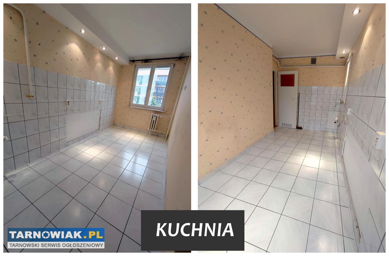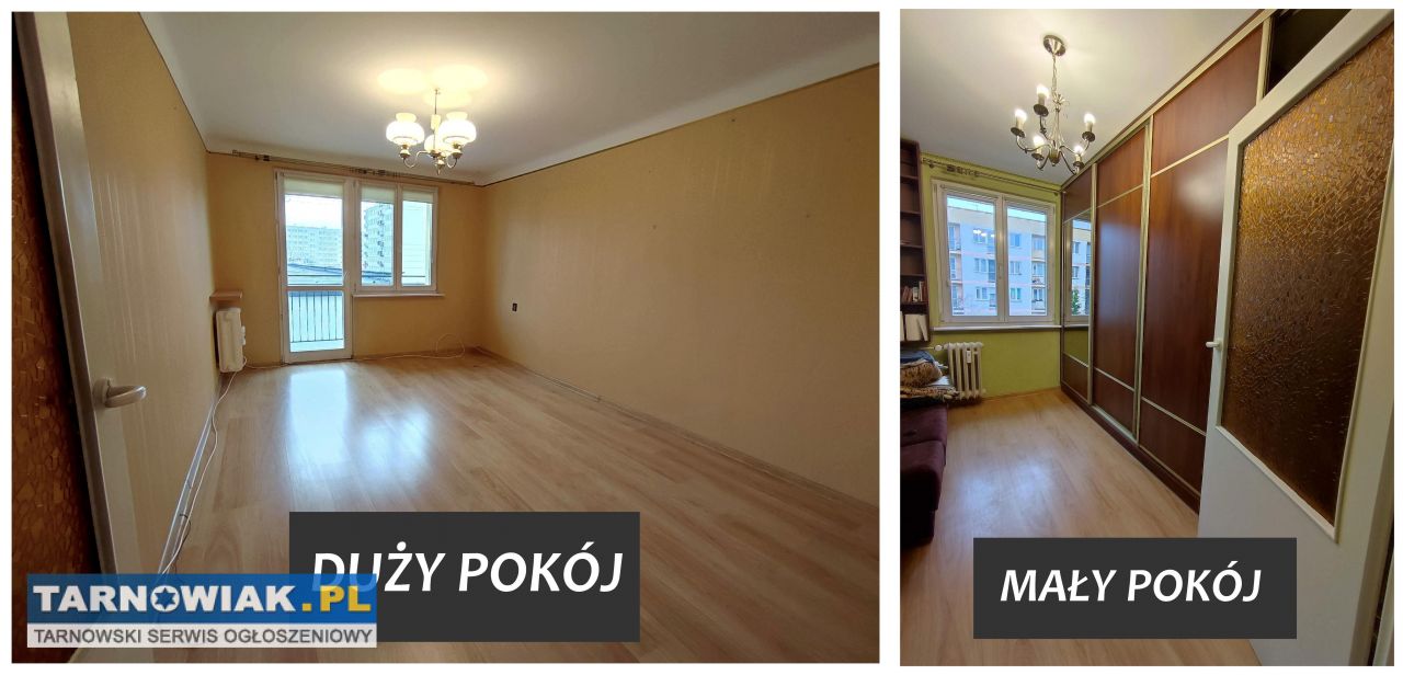 Mieszkanie składa się z dużego pokoju z wyjściem na balkon, drugiego mniejszego pokoju (obecnie znajduje się w nim szafa w zabudowie), przestronnej kuchni, łazienki z WC oraz przedpokoju.