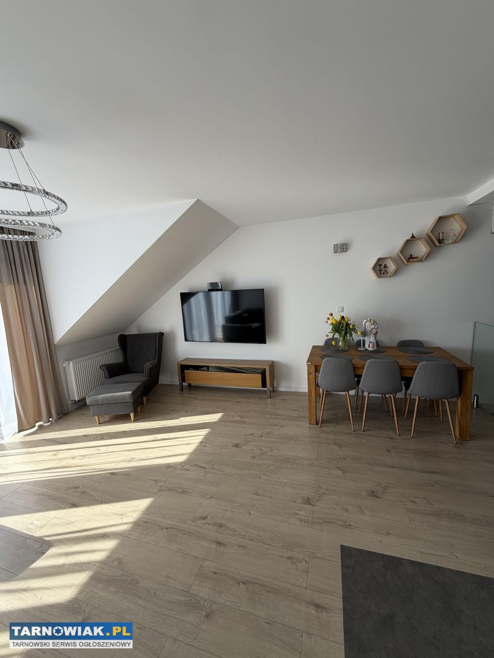 Wnętrze składa się z dwóch pokoi, jasnego salonu z aneksem kuchennym ,łazienki ,holu ,oraz zaadaptowanego strychu.
