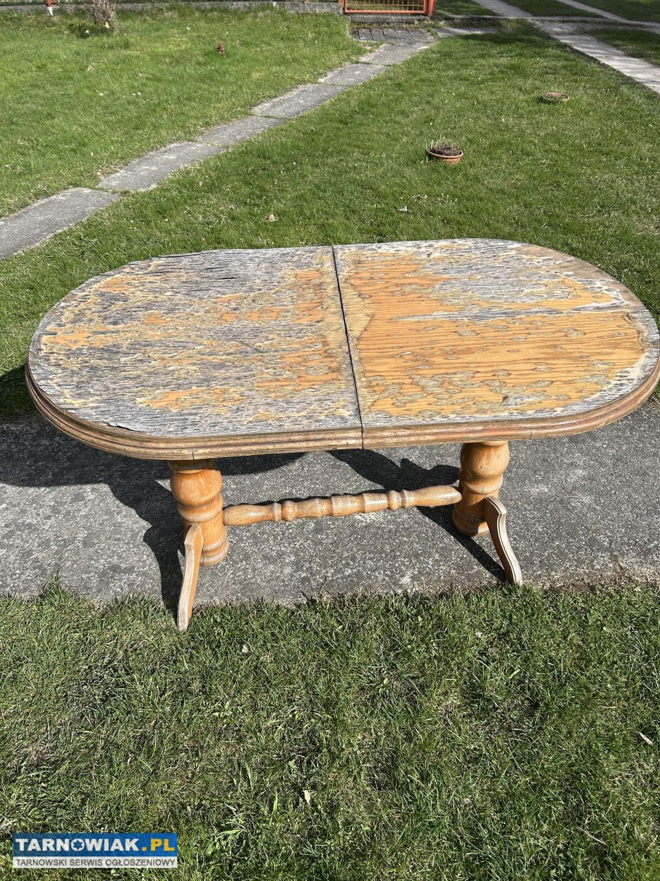 drewniany stół ogrodowy z blatem w kolorze pomarańczowo-szarym. Nogi stołu wykonane są z drewna, nadając mu rustykalny wygląd. Stół jest używany, ale wciąż w dobrym stanie. Może służyć jako praktyczny mebel do ogrodu lub na taras.