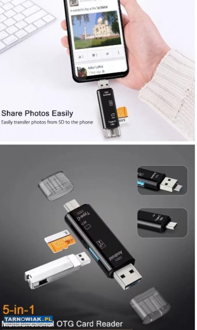 Nowy 5w1 Wielofunkcyjny czytnik kart pamieci USB 2.0 typC/Usb/Mikro Usb/TF/SD Adaoter OTG dla urządzeń mobilnych tj.komórka ,laptop, tablet itp. Długość 73,5mm szerokość 18,3mm za 16zl
