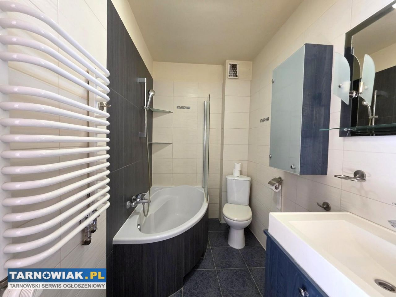 łazienki – z wanną i parawanem, umywalką z szafką, wiszącą szafką, toaletą oraz pralką.