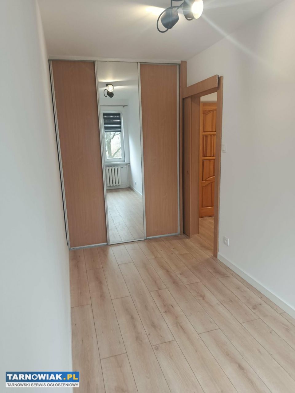 Sypialnia wyposażona w dużą szafę przesuwną z lustrami–na podłodze panele.Do mieszkania przynależy również piwnica.