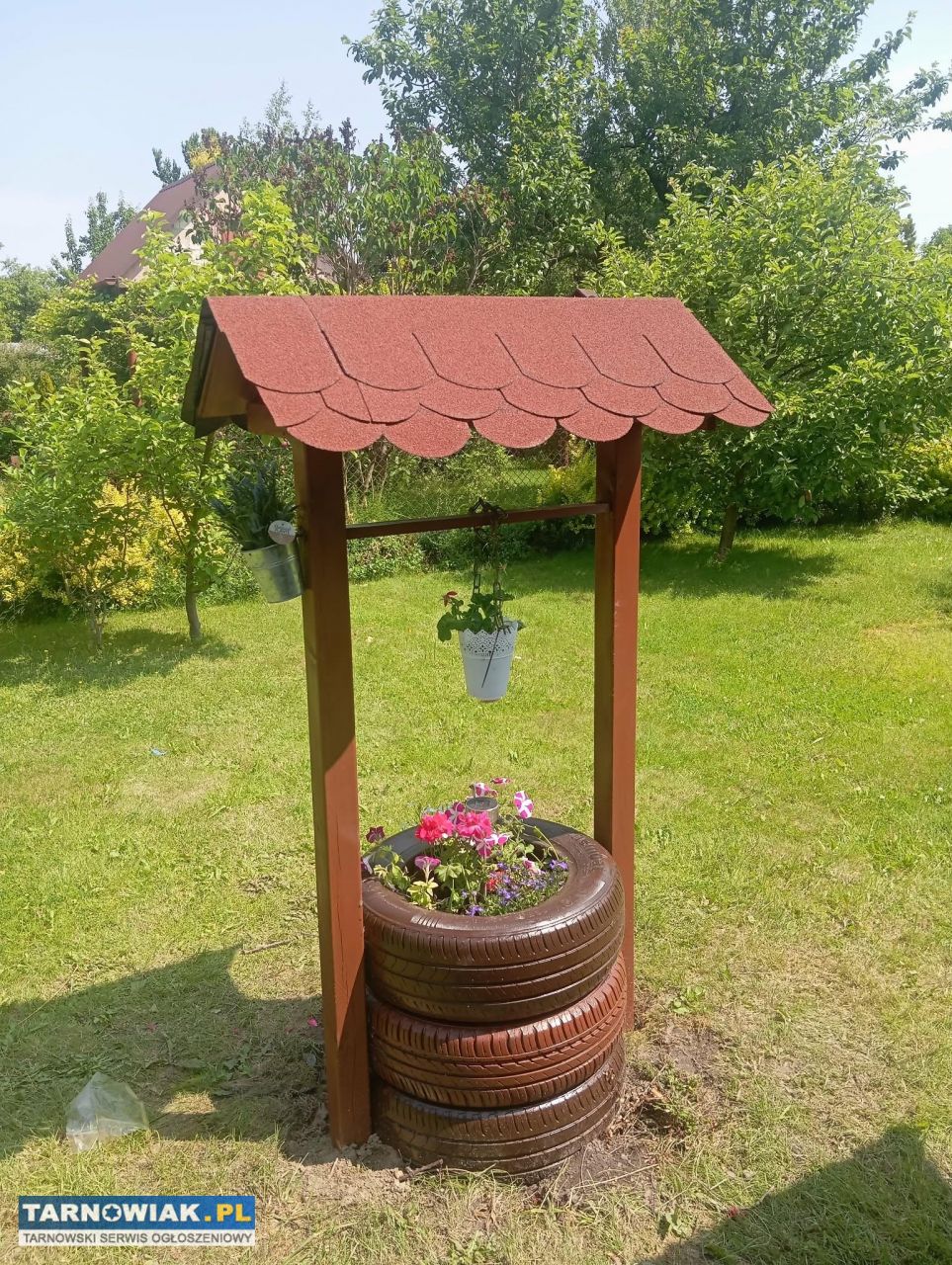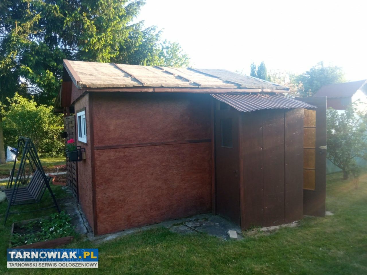 Jest ogrodzona, domek z zadaszonym tarasem, narzędziownia oraz WC.