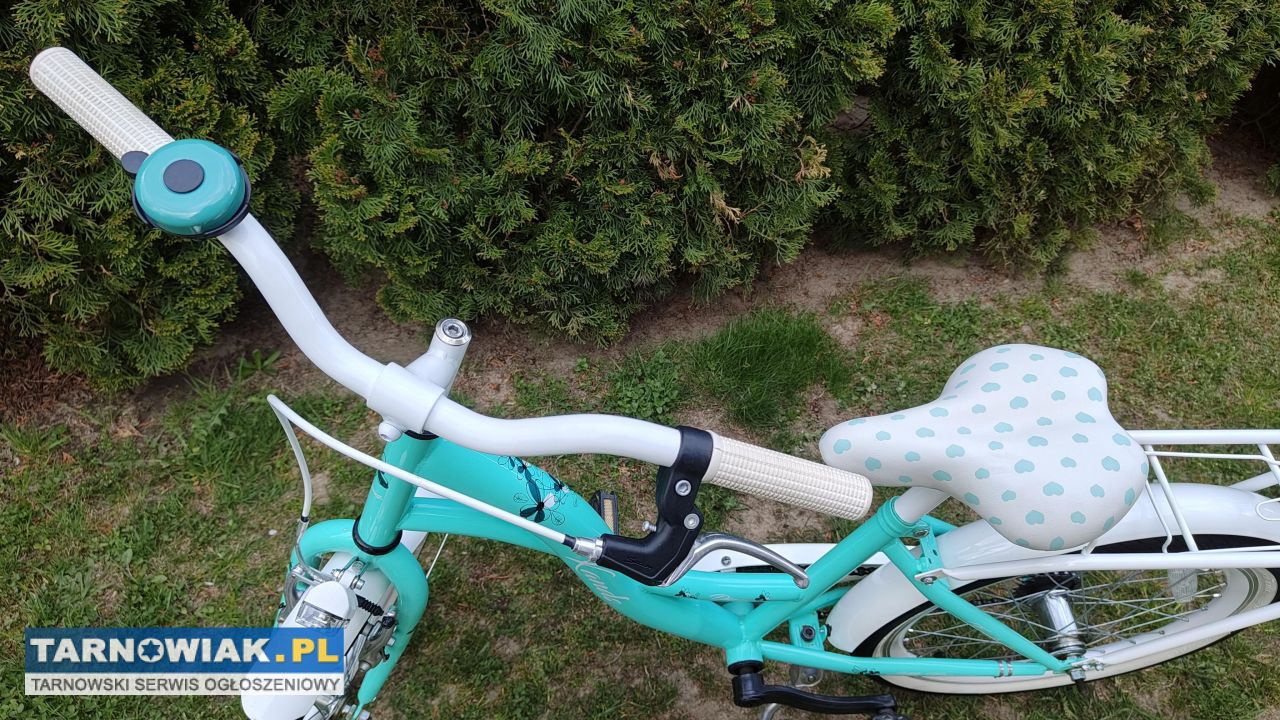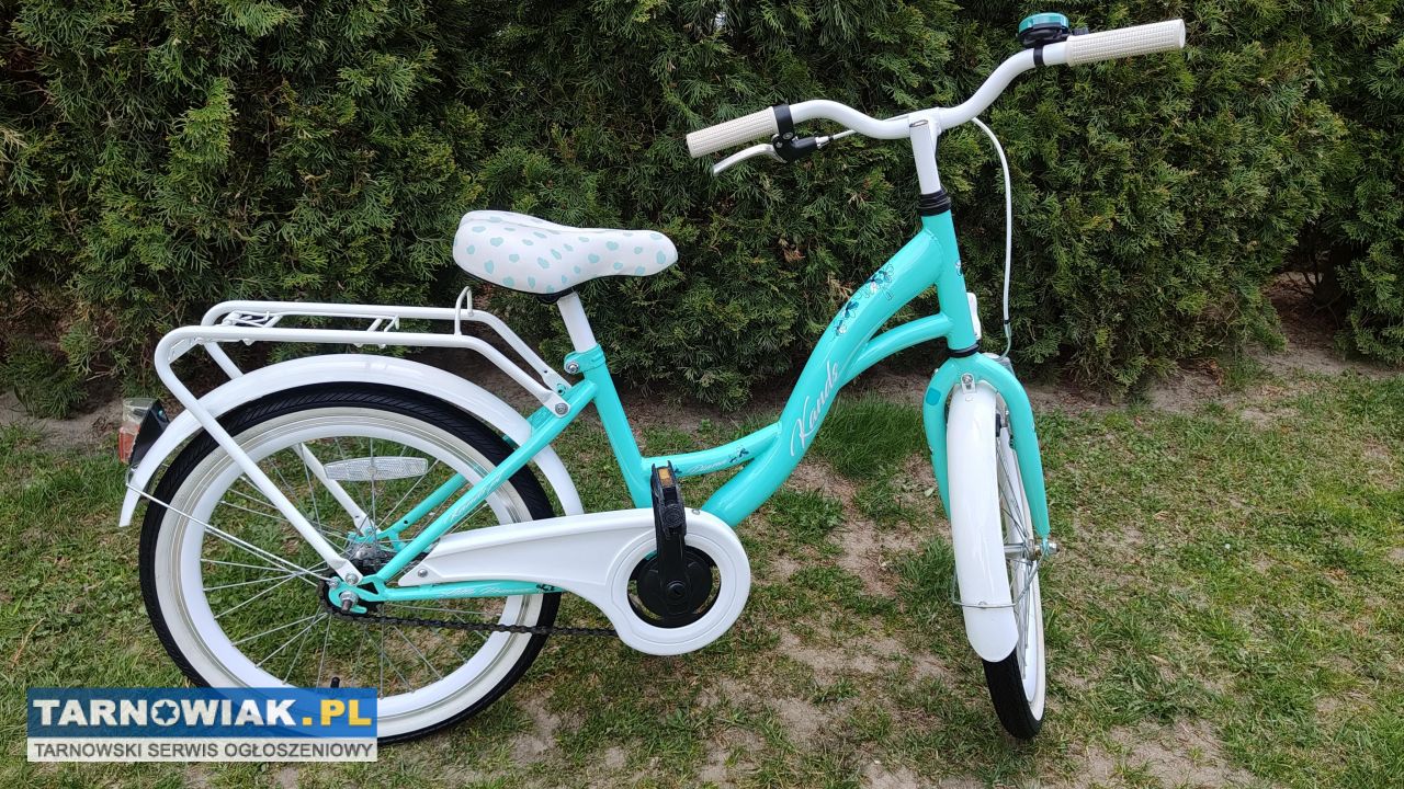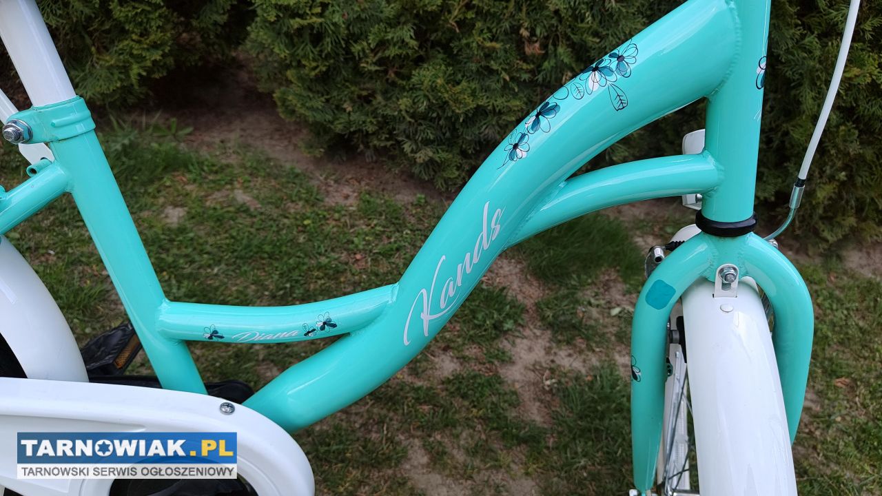 Sprzedam widoczny na zdjęciach rower Kands Diana na kołach 20 cali produkcji polskiej. Rama w rozmiarze 12 cali, siodełko jest nowe, hamulce sprawne, oświetlenie sprawne, bagażnik, dzwonek, błotniki. Rower w bdb stanie. Kolor miętowy plus biale wstawki. Odbiór wyłącznie osobisty Lisia Góra ul Długa 39A
