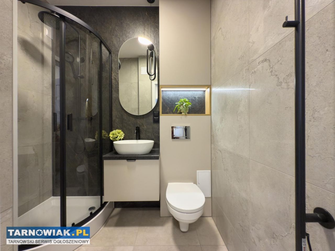 - Łazienka z kabiną prysznicową, pralką, zabudową stolarską i oświetleniem LED.