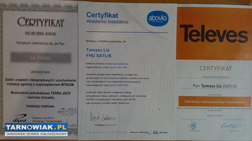 Ukończone szkolenia- Akademia Instalatora 2011 Abovio Vector,Szkolenie Wizja TV i Philips,Kursy Dipol,TElkom Telmor i Televes ponad 20 lat doświadczeń-Anteny z siłownikiem,obrotnica,polaryzacja kołowa,układy zez na wiele satelit,pasmo C ,Wizja tv,Cyfra+.Posiadamy do wyboru,do koloru anteny szare,białe,kable A Class,uchwyty,narzędzia Metabo,DeWalt oraz WIEDZĘ.