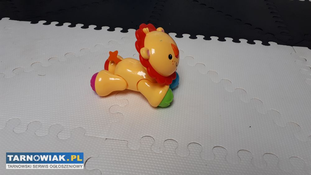 Przyjazny Lewek, któremu można kręcić główką oraz poruszać nogami, zachęcając dziecko do zabawy i ćwiczeń manualnych. Kończyny lewka klekoczą przekręcane przez dziecko