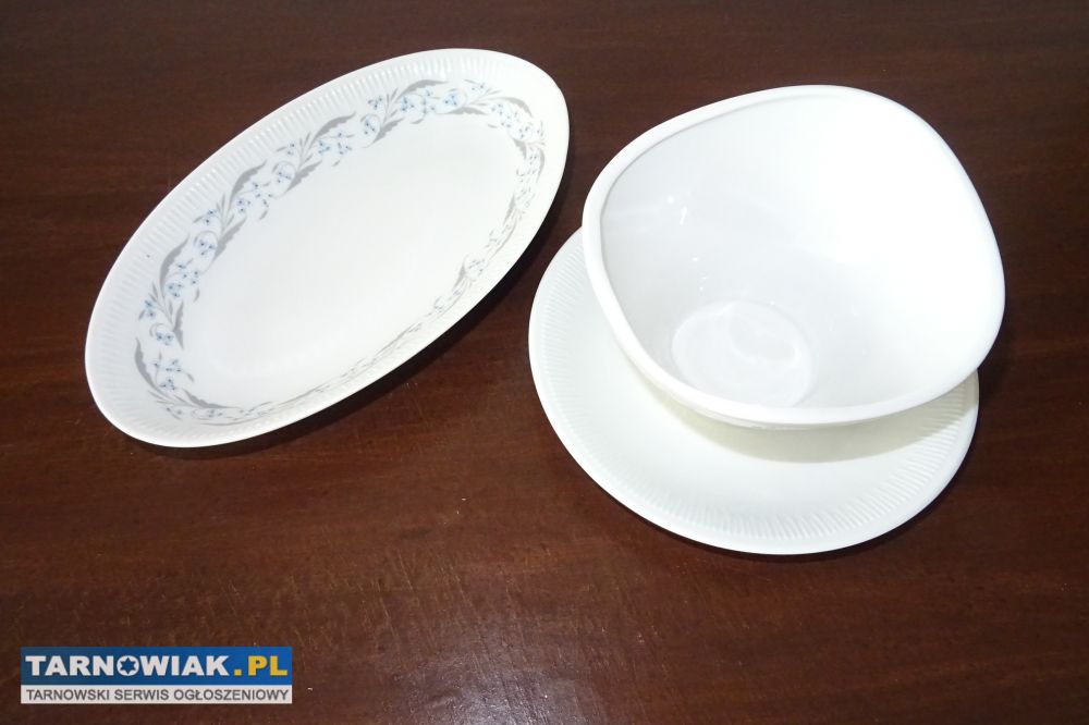 Sprzedam zestaw polskiej porcelany z Włocławka półmisek ze sosjerką w małe niebieskie kwiatuszki niezapominajki w bardzo dobrym stanie dł półmiska 24cm szer.14cm średnica sosierki 14,5/13,5cm u dołu 18cm za 28zł