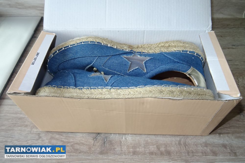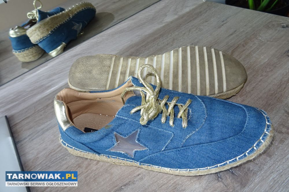 Sprzedam raz ubrane śliczne buty z lekkiego niebieskiego dżinsowego materiału,podszyty skórką rozmiar 40 według mnie to 39 firmy Vinces wiązane sznurówką koloru złotego ze złotą wstawką na pięcię z wszytą siateczkową gwiazdką po obu stronach ,która zapewnia wentylacje stopy długośc wkładki 25cm wysokośc podeszwy z tyłu 3cm za 36zł