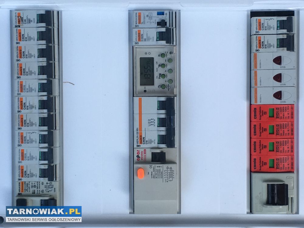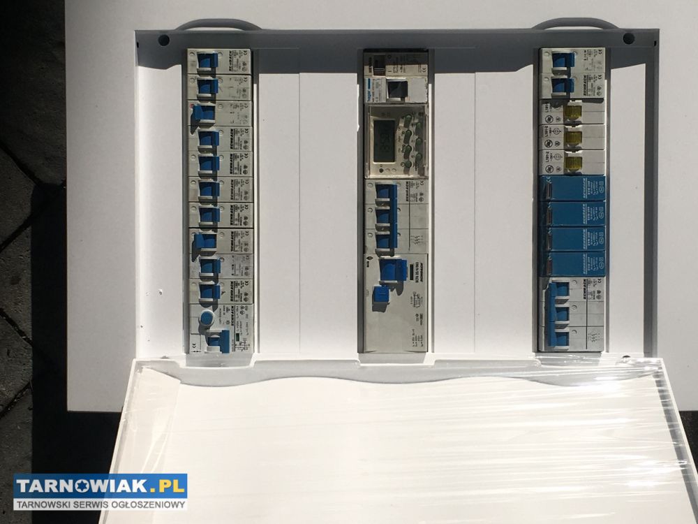 Witam. Sprzedam niesznurowaną, nową podtynkową rozdzielnię elektryczną, a drzwiczki rozdzielni są jeszcze zafoliowane a znajdujący się w niej osprzęt renomowanej firmy jest używany, ale wizualnie jak i technicznie w bardzo dobrym stanie , a wszystko powinno być sprawne i działać prawidłowo, lecz, nie daję gwarancji, ponieważ jest to towar z demontażu. Z tym osprzętem rozdzielnia idealnie nadaje się do rozbudowy, albo zabudowy do nowego domu , jako system, BEZPIECZNY DOM, dlatego dla ochrony sprzętu domowego, posiada zabezpieczenie przeciw wyładowaniom atmosferycznym, a dla bezpieczeństwa domowników zabezpieczenia przeciwporażeniowe , Z tego powodu rozdzielnia wyposażona jest, w wyłącznik główny, ochronnik ogranicznik przepięć, wyłącznik różnicowoprądowy 3-fazowy i różnicowoprądowy 1-fazowy, oraz wyłącznik nadprądowy 3-fazowy, i wyłączniki nadprądowe 1-fazowe,kontrolki faz, zegar sterujący i przekaźnik, dokładnie to co widać na zamieszczonych zdjęciach. Tel. kontaktowy 600199279 Nie wysyłam za pobraniem, a rozdzielnie mam z osprzętem różnych renomowanych firm