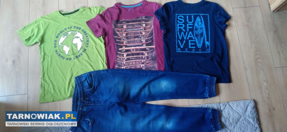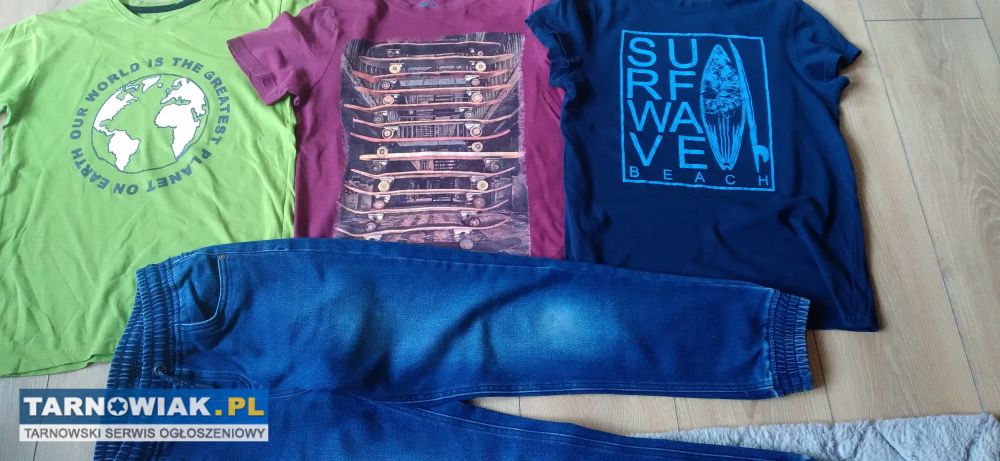 Sprzedam spodnie rozmiar 146/152 długość całkowita 86 cm oraz 3 koszulki rozmiar 146 cena za całość 35 zł