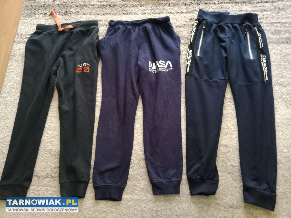 Trzecie zdjęcie brązowe r 140 podszyte pokarmie ciepłe na zimę zapinane na guzik ale mają regulacje 15 zł, popielate dresy r 140 10 zł, granatowe dołożę jeśli komuś spasuja