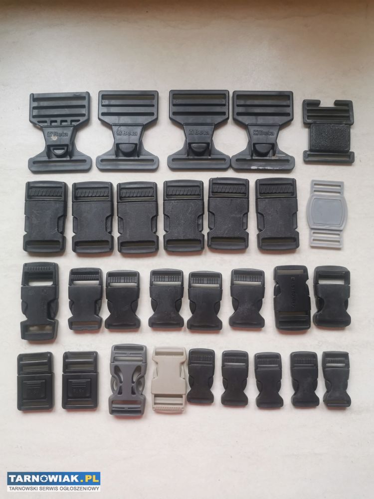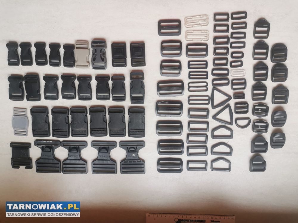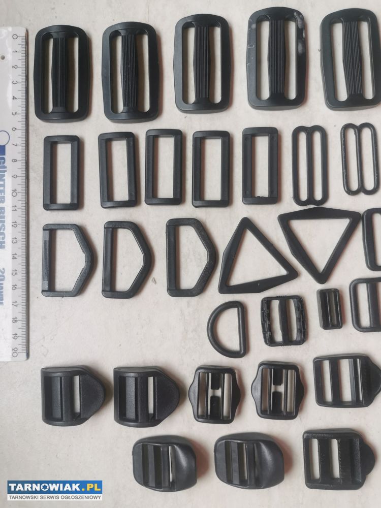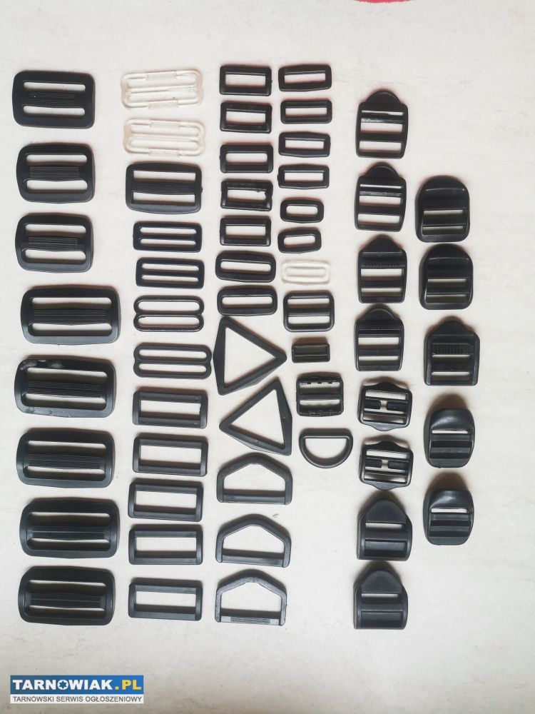 Klamry plastikowe, regulator przesuwny, półkółka, uchwyty do taśmy, paska...