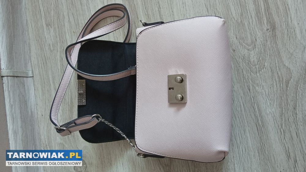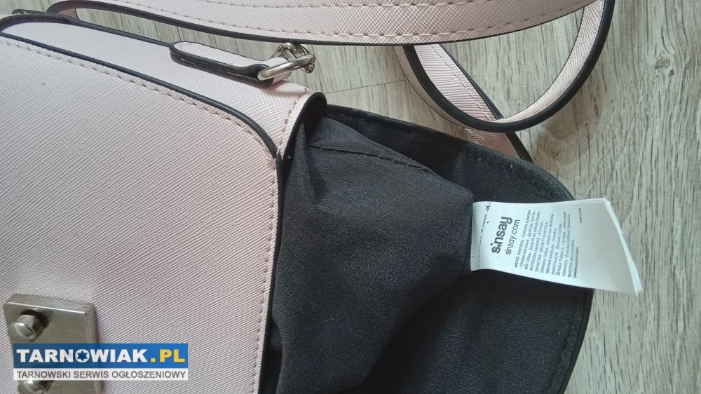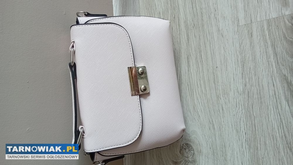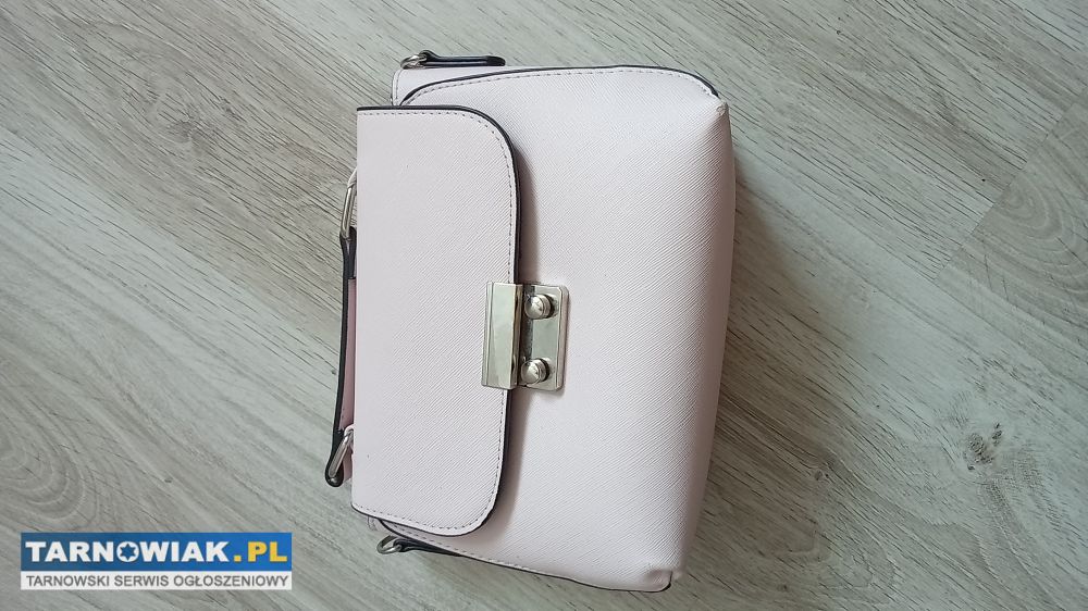 Nowa bez metki mała pojemna torebka firmy Sinsay koloru pudrowy róż zapinana na zatrzask z regulowanym paskiem z łańcuszkiem o długości max 125cm z duza komorą w środku i kieszonką na zamek ,szerokość u góry i u dołu 22cm wysokość 17cm ,szerokość podstawy 7,5cm za 23zl