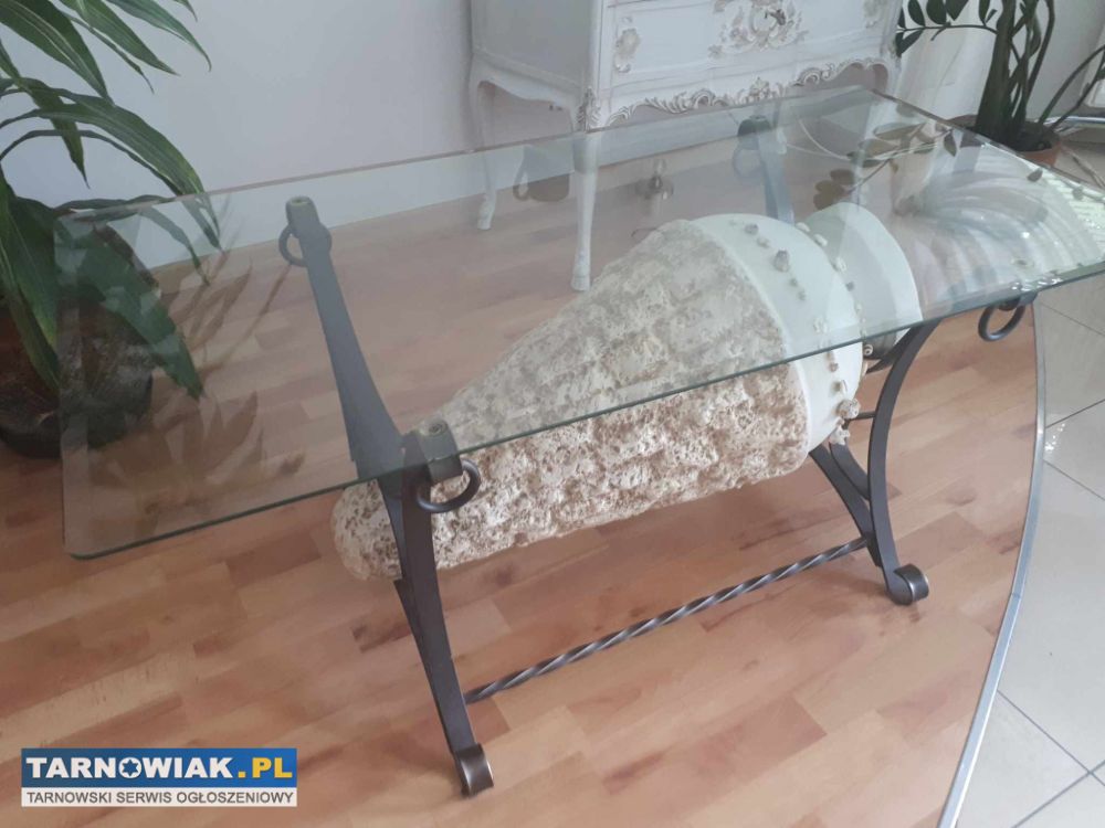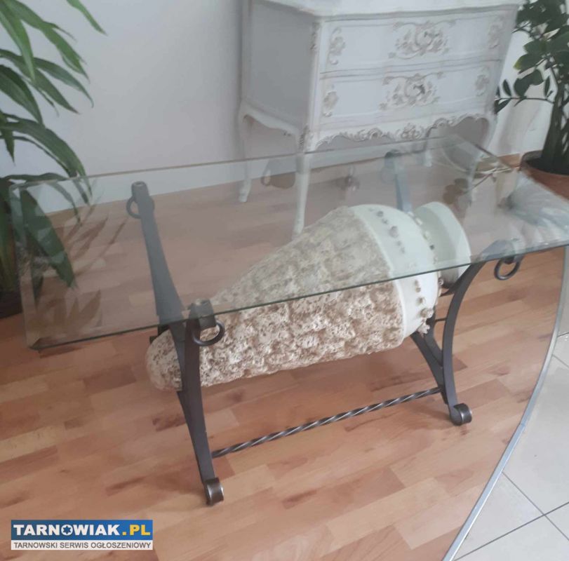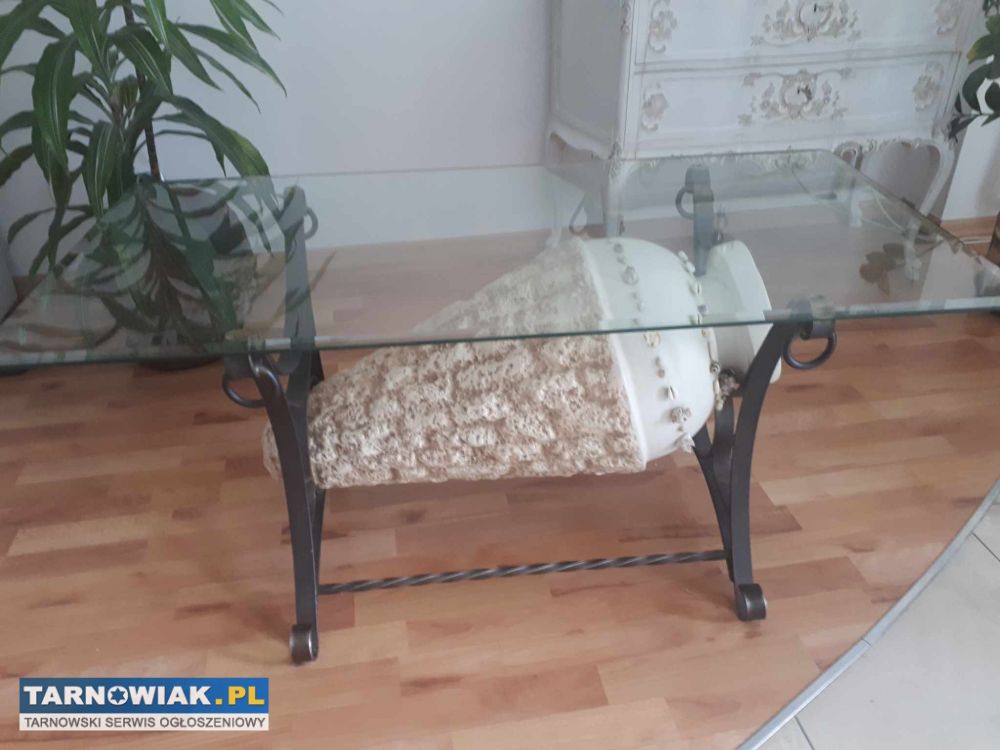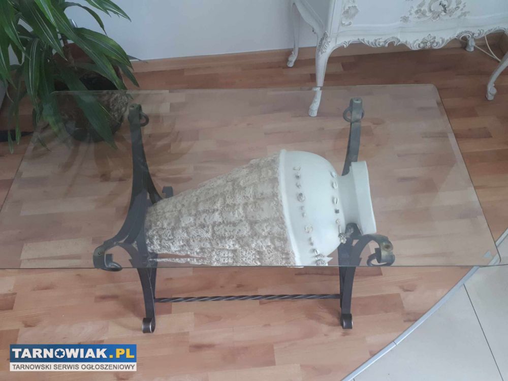 Sprzedam piękną ławę - stolik kawowy z blatem szklanym na metalowych nogach i z ozdobnym wazonem.