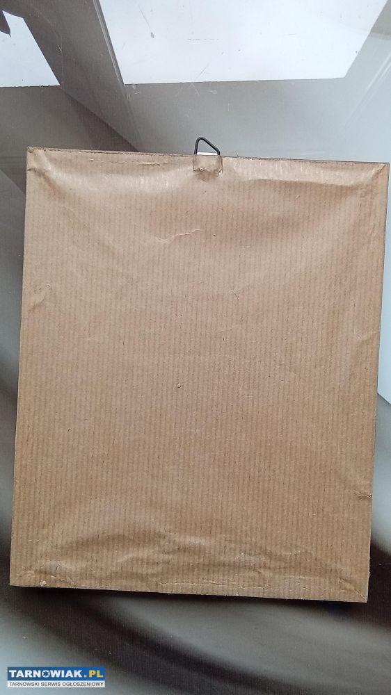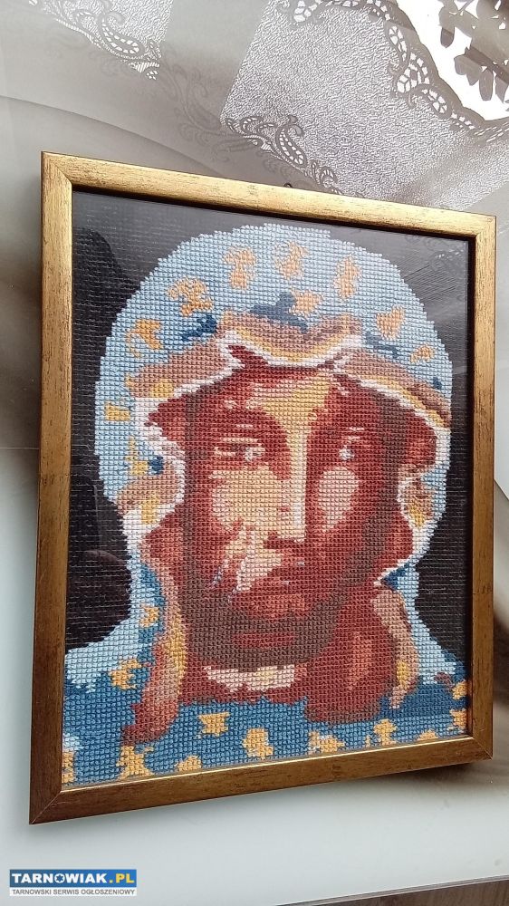 Obraz antyk Matka Boska w drewnianej "nie ze sklejki" ramce kolor metaliczne złoto, haft krzyżykowy w bardzo dobrym stanie rozmiar 32 /25,5 cm za 56zl