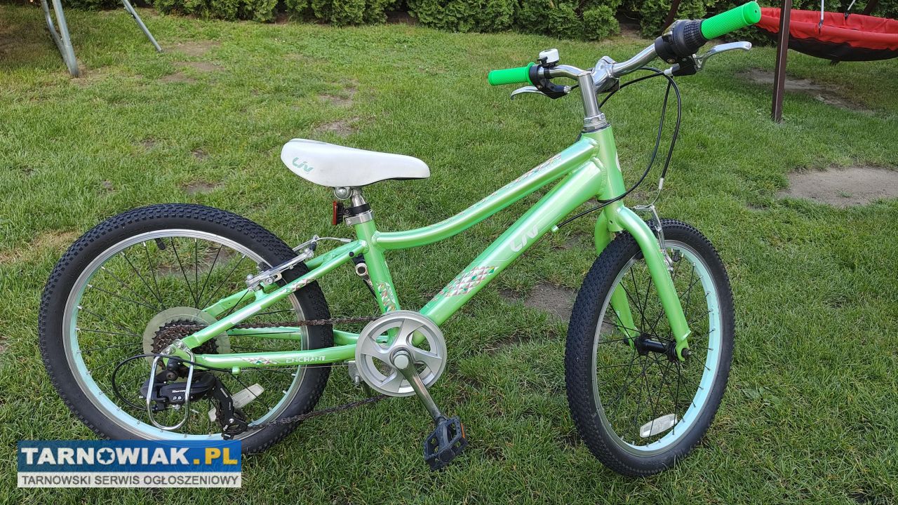 Sprzedam widoczny na zdjęciach rowerek Giant Liv Enchant na kołach 20 cali. Aluminiowa lekka rama, opony wysoki bieżnik, siodełko bez dziur, przerzutki i hamulce sprawne, nowe chwyty gumowe kierownicy. Kolor jasno zielony metalik. Rower używany, sprawny. Odbiór wyłącznie osobisty Lisia Góra ul Długa 39a