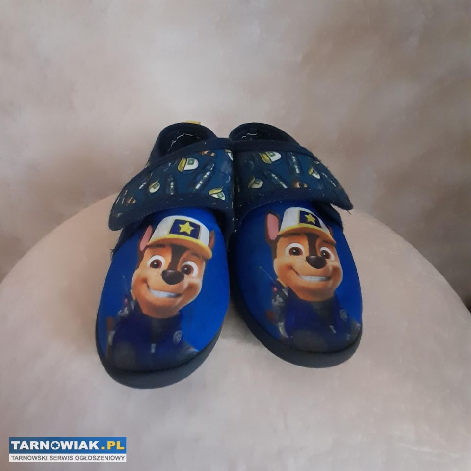Sprzedam kapcie chłopięce z bajki Psi Patrol w rozmiarze 27 długość wkładki wewnątrz buta 17 cm. Kapcie są w dobrym stanie jeszcze komuś posłużą.