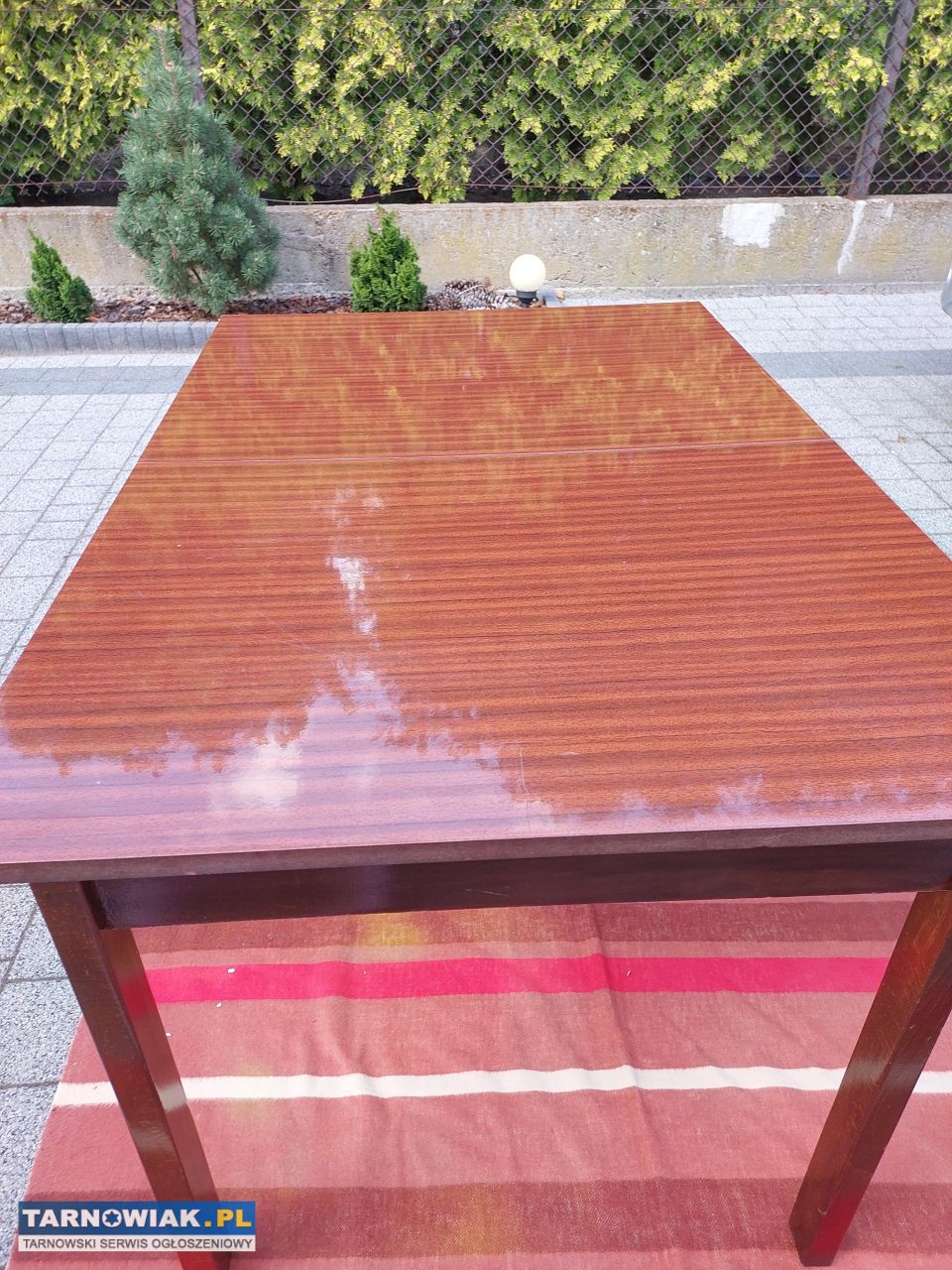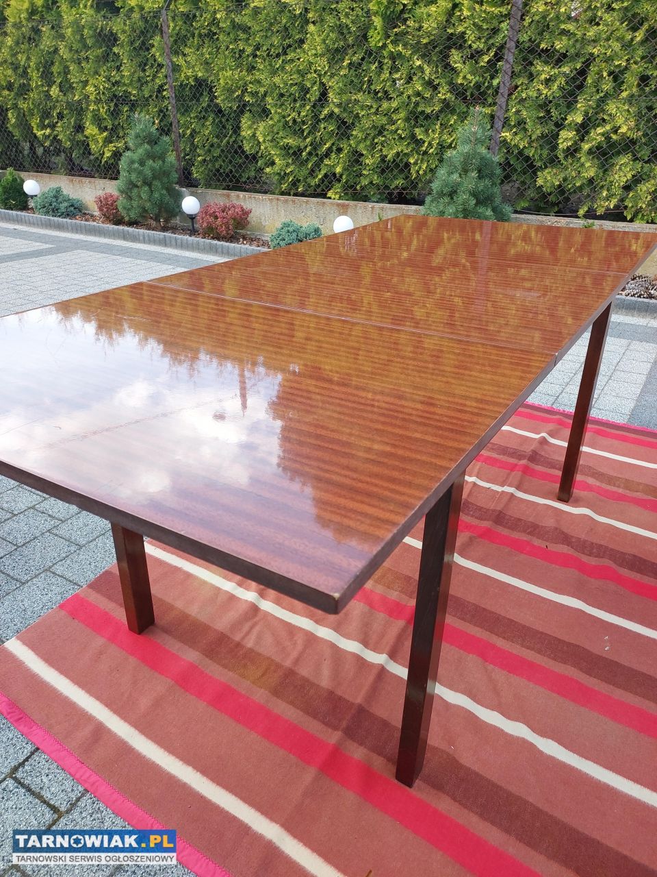 Sprzedam stół jadalniany z rozsuwanym blatem na wysoki połysk w kolorze machoń z czasów PRL. Stół w dobrym stanie ze śladami użytkowania , stabilny i solidny.