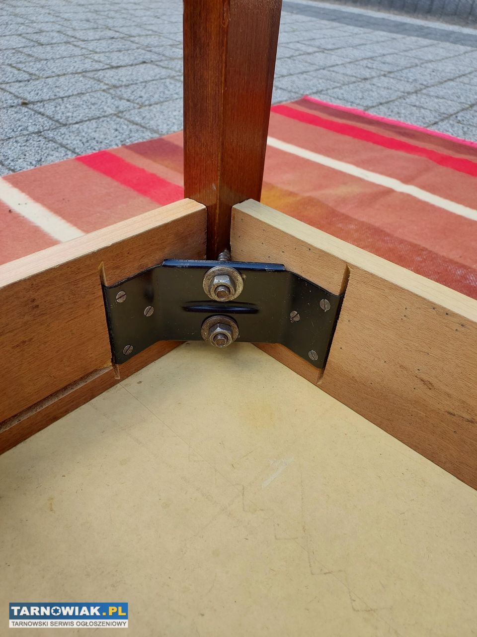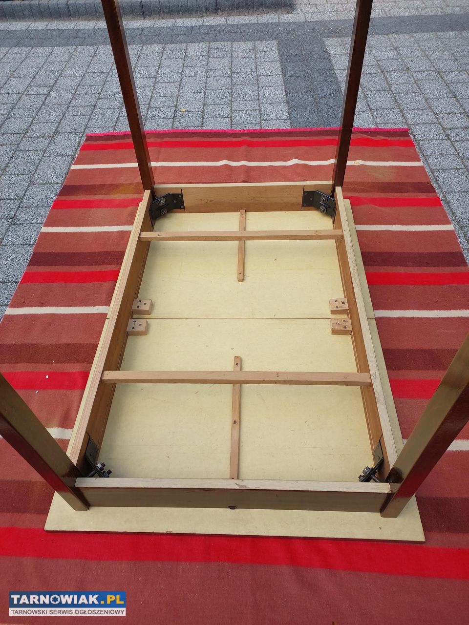 Wkładka blatu chowana pod blatem złożonego stołu. Łatwy montaż nóg , każda przykręcana dwoma nakrętkami M-8.