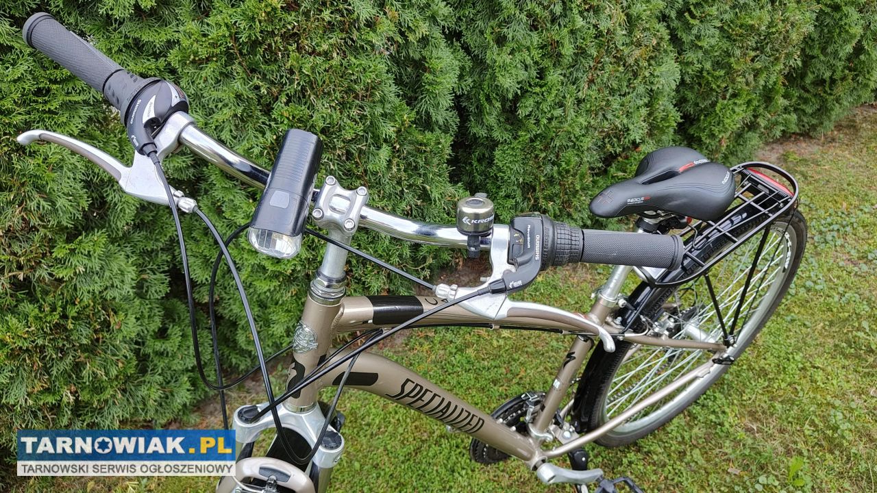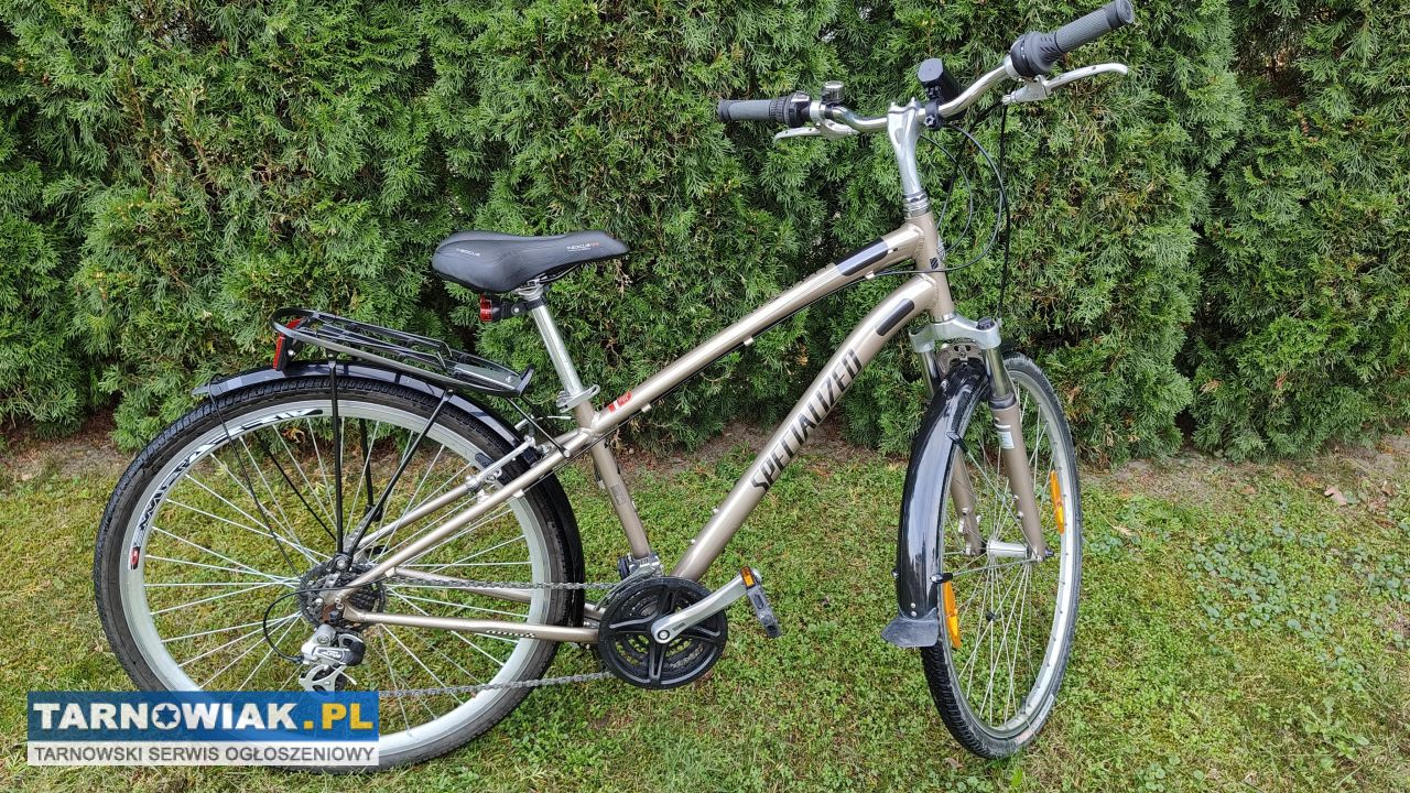 Sprzedam widoczny na zdjęciach rower Specialized Carmel na kołach 28 cali. Aluminiowa rama w rozmiarze 17 cali, rura siodełka jest długa więc nadaje się dla nas to latki lub osoby dorosłej, siodełko żelowe bez dziur, sprawne oświetlenie, amortyzator sprawny, przerzutki i hamulce działają. Dzwonek, błotniki, bagażnik. Kolor złoto brązowy metalik. Odbiór wyłącznie osobisty Lisia Góra ul Długa 39a