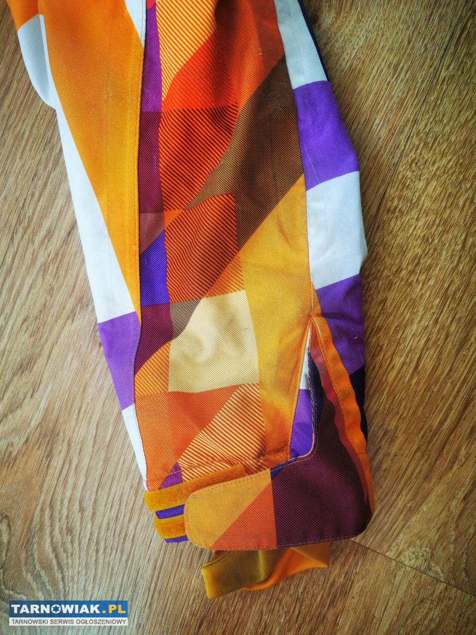 Kurtka jest już trochę podniszczona i przybrudzona, od noszenia deski, najbardziej z prawej strony.