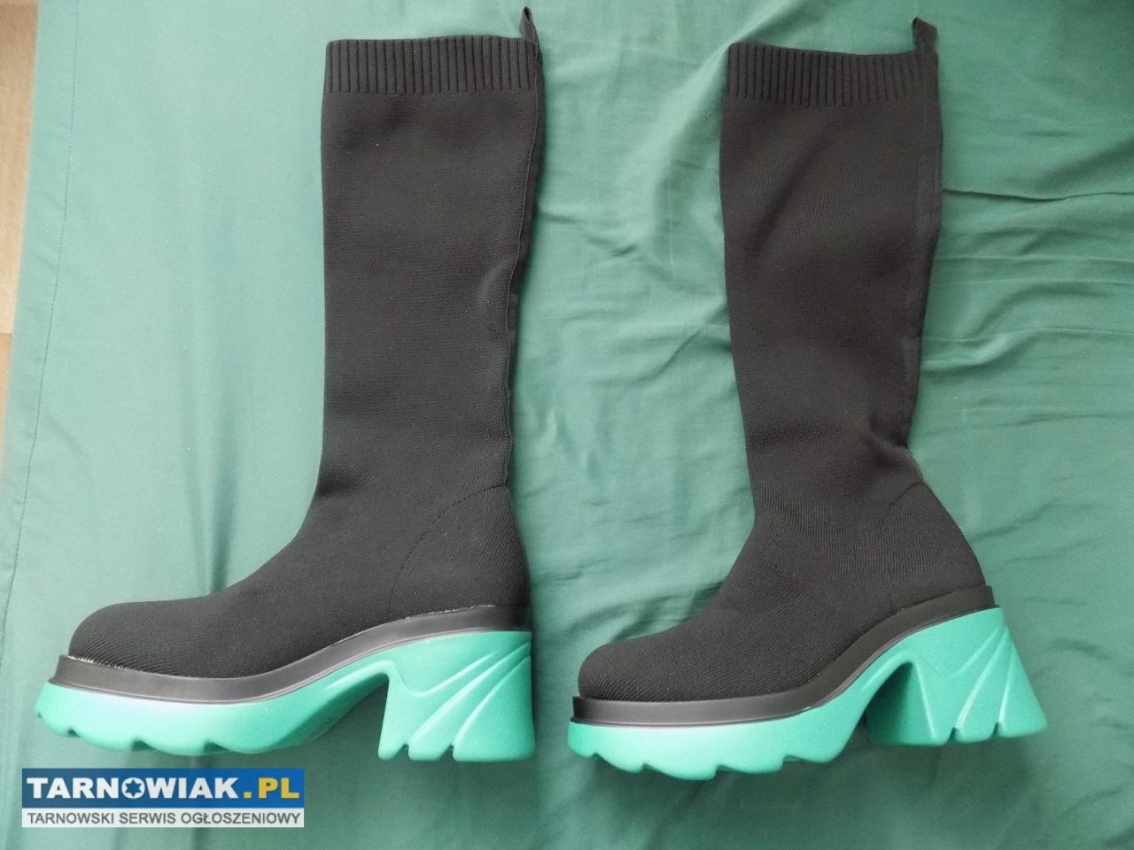 Nie są ocieplane, podszewka materiałowa, wykonane z materiału, wysokość obcasa: 8cm, wysokość cholewki: 39 cm, rodzaj obcasa: klocek, tęgość: G, wysokość platformy: 3cm, obwód cholewki: 41 cm, nosek okrągły, długość wkładki: 24,5 cm.