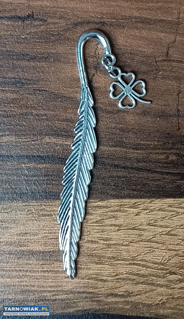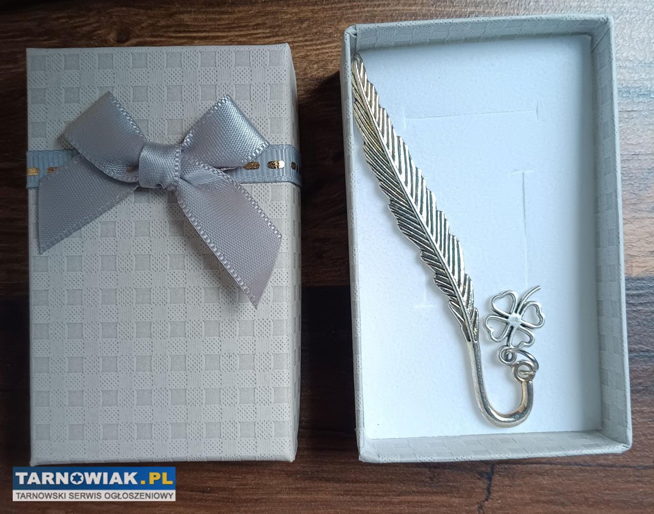 Metalowa zakładka w kształcie pióra w ozdobnym pudełku z koniczynką