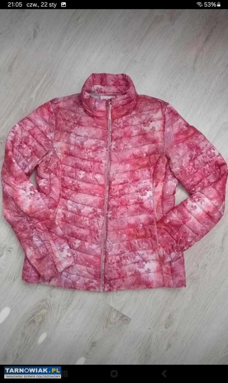 Lekka pikowana różowa w kwiatowe wzorki kurtka ze stójką z kieszeniami po bokach zapinana na zamek firmy Esmara rozmiar 40/42 długość 65cm ,rękawa od barku 74cm od ramienia 64cm szerokość pod pachami 2x51cm w pasie 2x47cm u dołu 2x55cm za 29zl