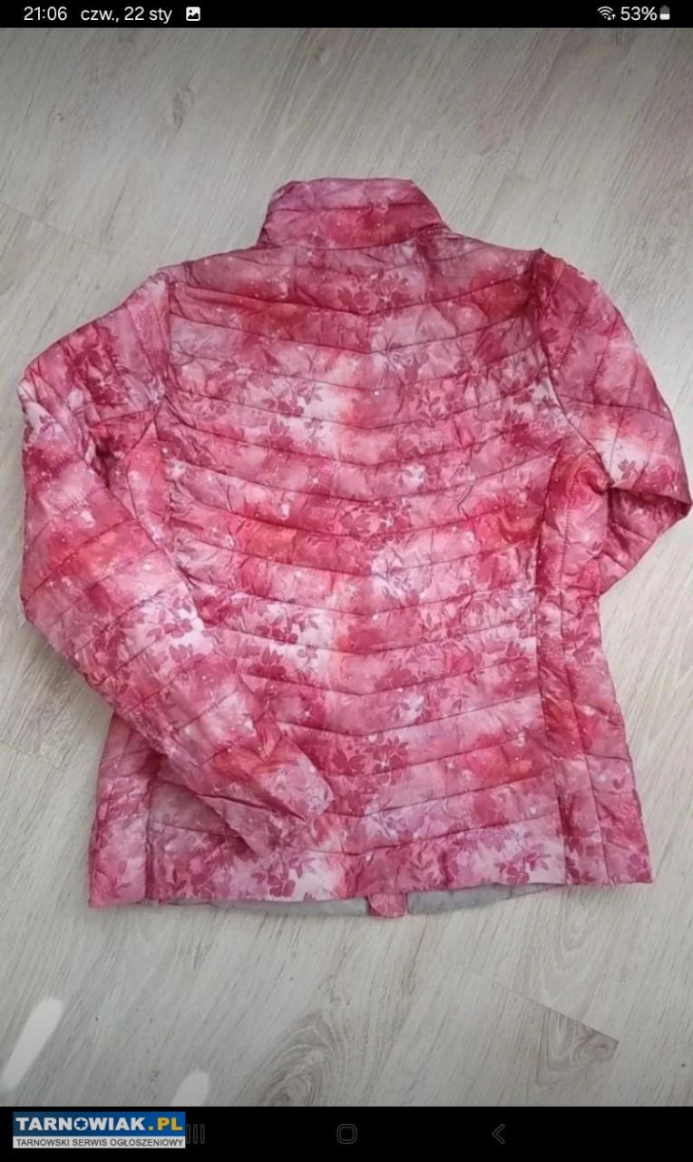 Lekka pikowana różowa w kwiatowe wzorki kurtka ze stójką z kieszeniami po bokach zapinana na zamek firmy Esmara rozmiar 40/42 długość 65cm ,rękawa od barku 74cm od ramienia 64cm szerokość pod pachami 2x51cm w pasie 2x47cm u dołu 2x55cm za 29zl