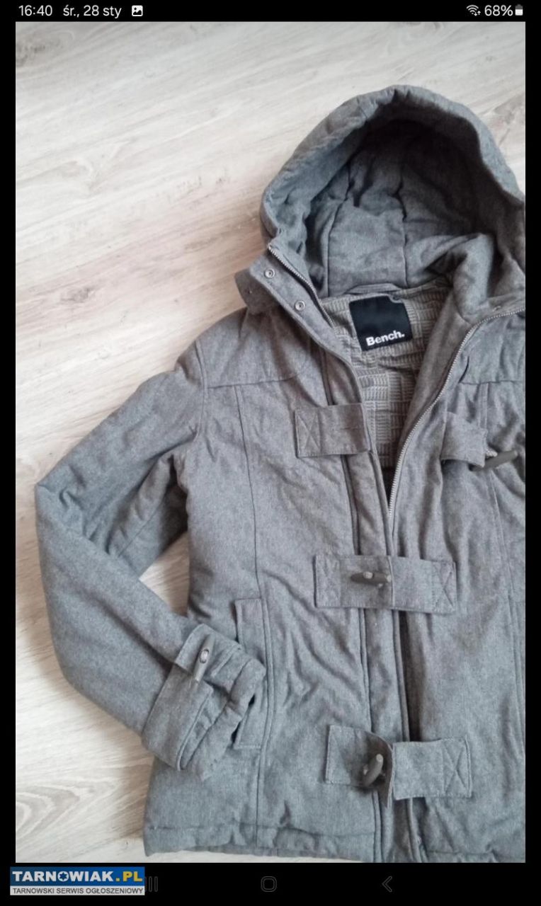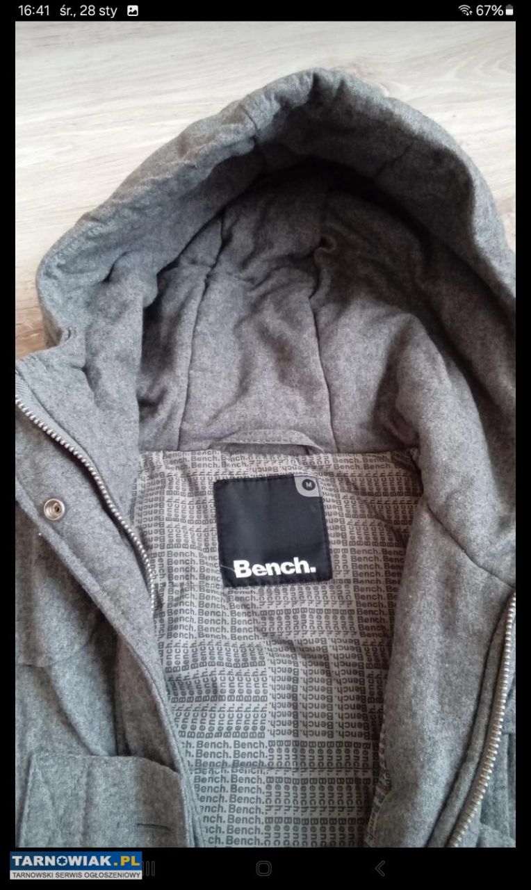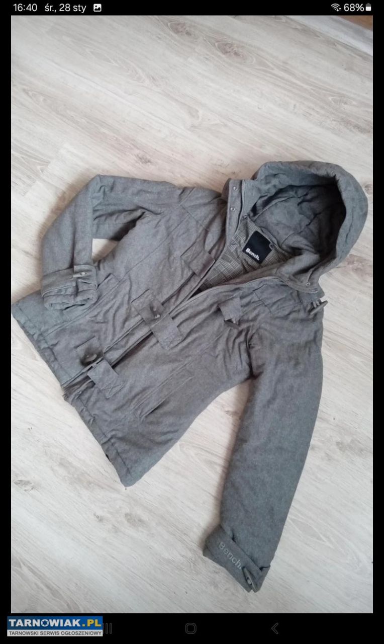 Szary ciepły,modny płaszczyk renomowanej firmy Bench zapinany na zamek dodatkowo na zatrzaski I jeszcze na modne guziki z ciepła kapuzą, podszewka z firmowymi oznaczeniami rozmiar M długość 65cm,rękawa 72cm ,szerokość pod pachami 2x49cm u dołu 2x52cm koszt nowego to ponad 250zł sprzedam za 45zl