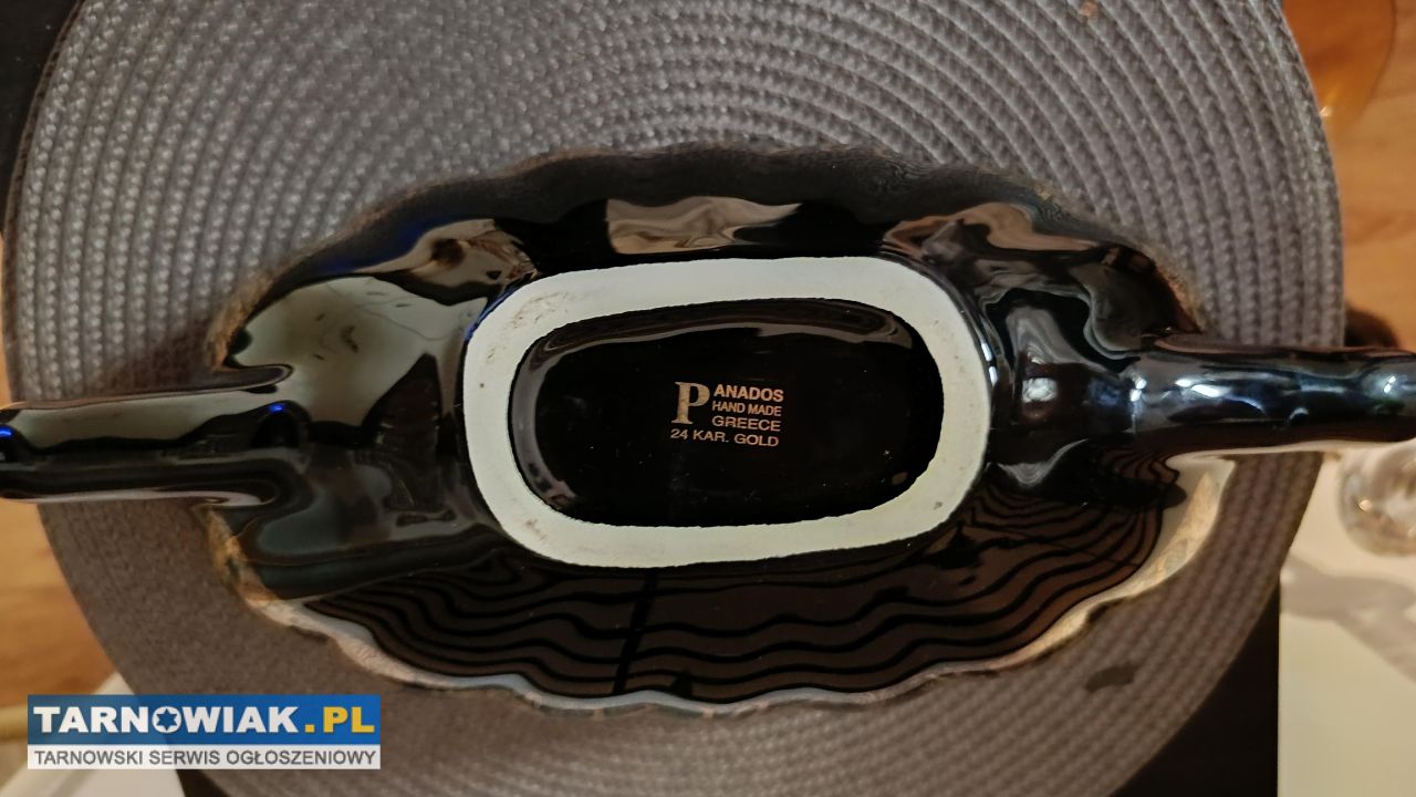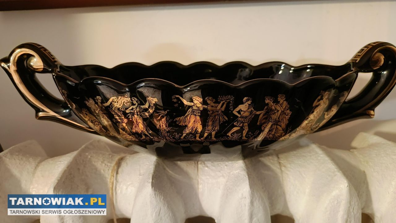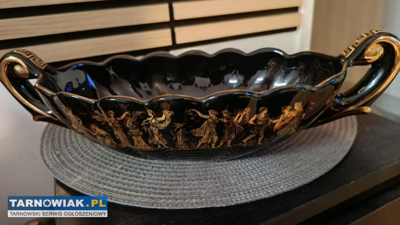 witam sprzedam misę z greckim wzorem meandrowym 24karatowym złotem misa moze byc na owoce lub cukierki lub na biżuterie jedna wada lekki odprysk na jednym uchu wymiary misy 37/14 cena 150 zł tel 694265325..