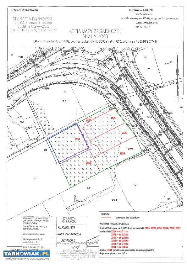 W załączeniu mapa z wydzieloną działką. Pozostałe dokumenty do wglądu.