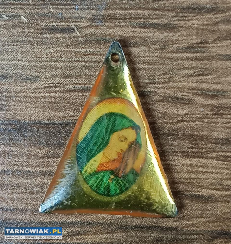 Trójkątny stary medalik zawieszka z żywicy z wizerunkiem Matki Boskiej z Guadalupe Vintage