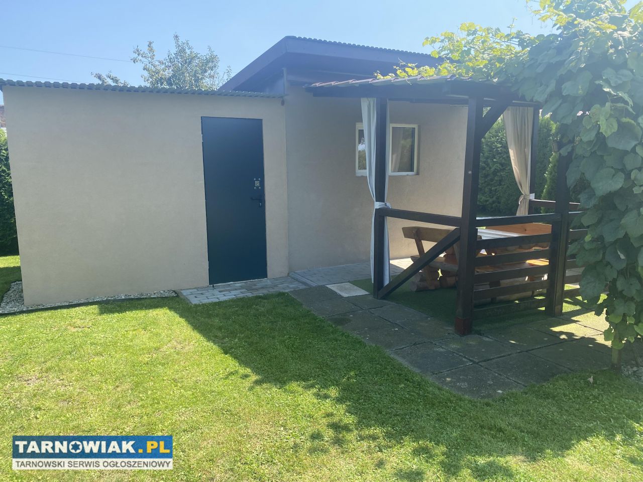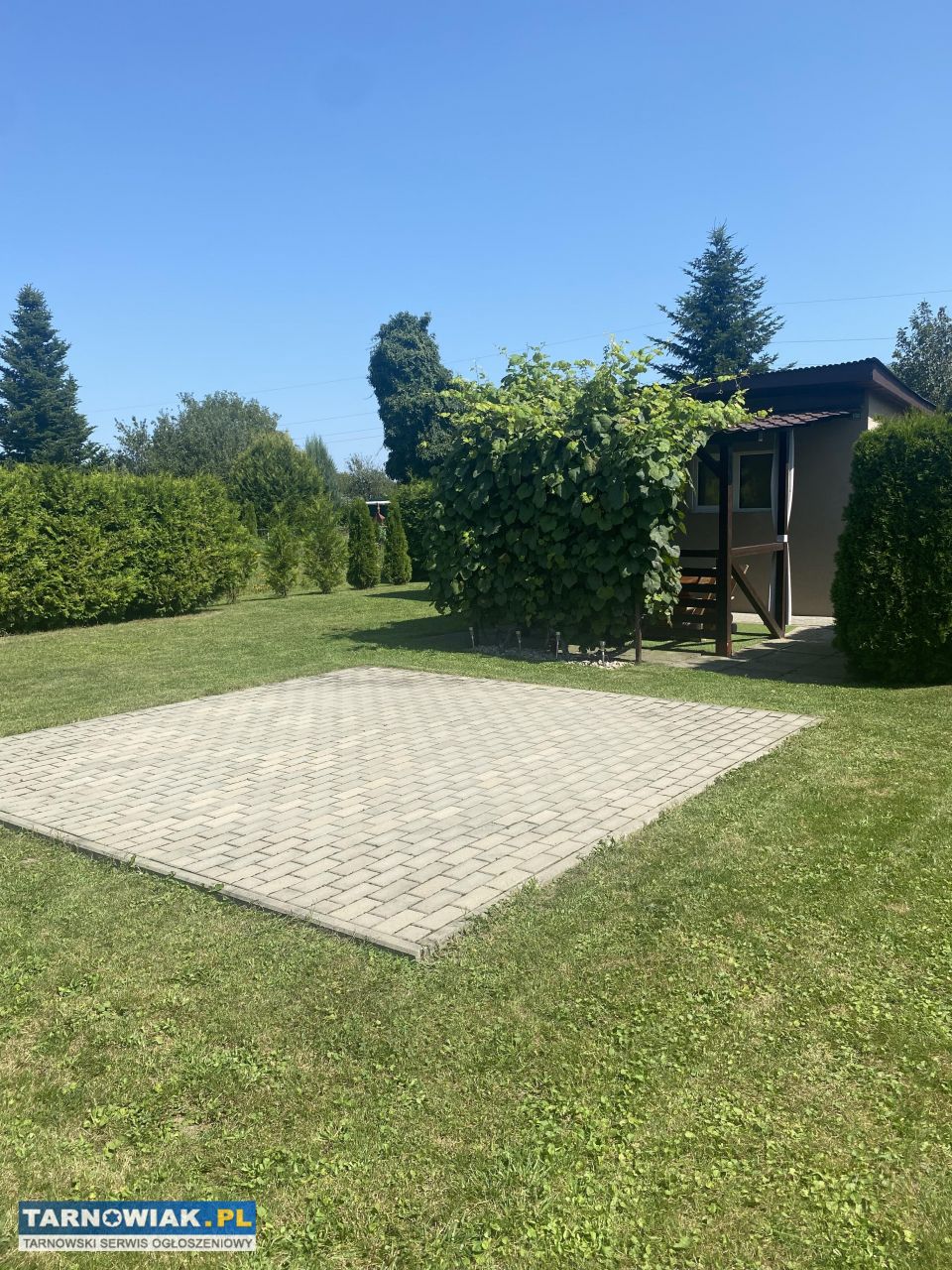 Na działce altanka z meblami drewnianymi , kostka brukowa, miejsce na basen